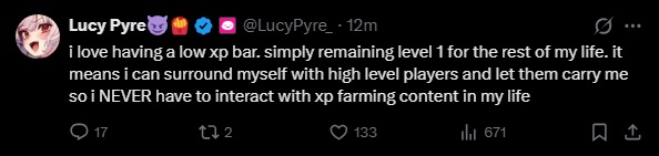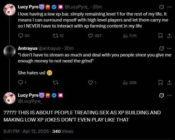 >>111048572Lucy has autism so she read the low xp line in the dockey and now it lives rent free in her lexicon.