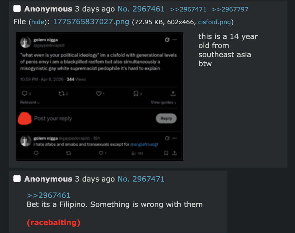 >111050840nigger trying one of the most pathetic angles I've seen in a while