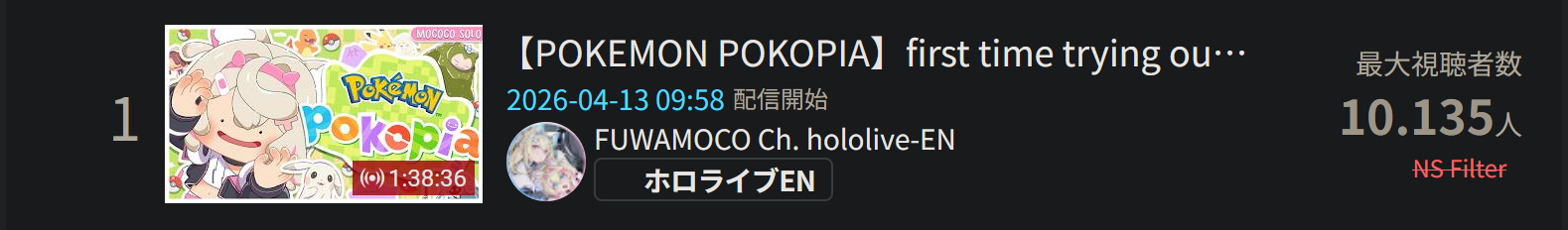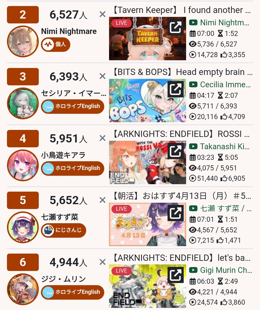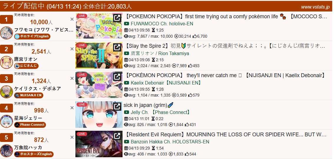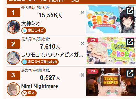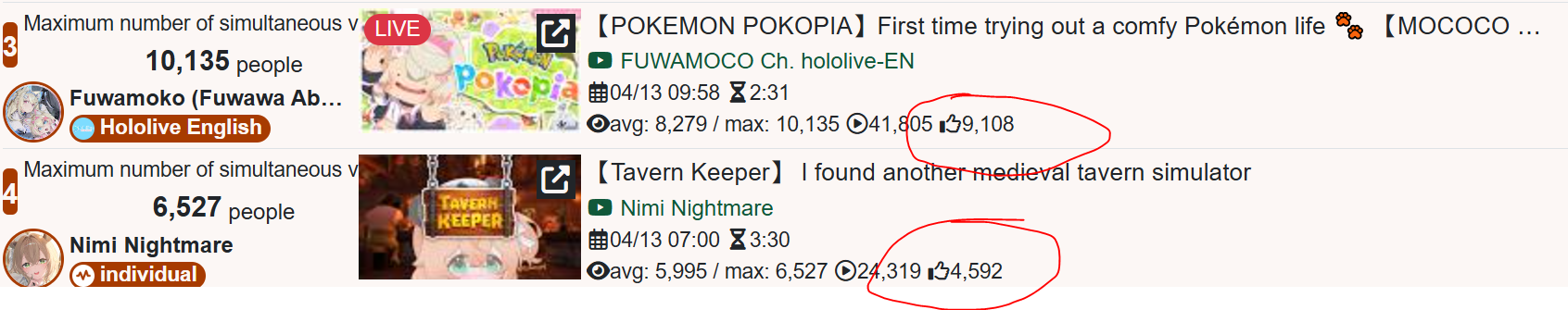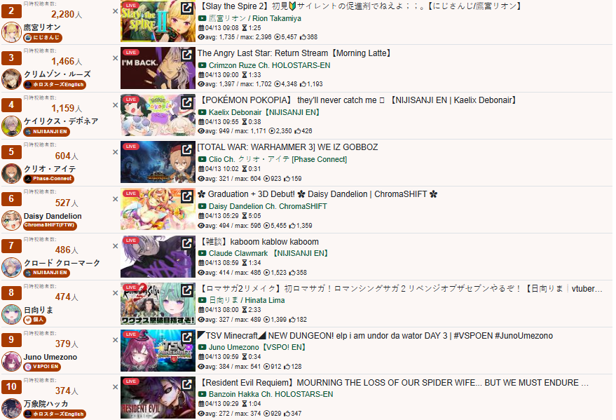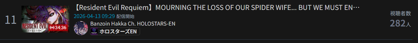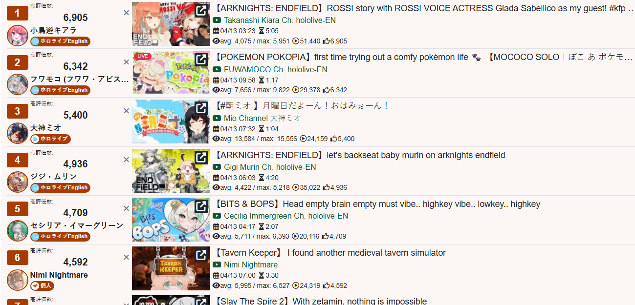 *APRIL 12TH 2026 FINAL EN TALLY*>12,683: FUWAMOCO (<3) (Hololive English)>10,018: Cecilia (Hololive English)>9,692: Cecilia (Hololive English)>7,400: Nerissa (Hololive English)>7,274: Bijou (Hololive English)>6,094: Calliope (Hololive English)HOLOEN-ONLY TALLY COUNTER: 6I was told someone was going to be in this tally, but I don't see him. Gold for Fuwawa and Mococo Abyssgard with their playthrough of the Mortuary Assistant alongside Gigi, Silver for Cecilia Immergreen's playthrough of Spider Man plus Drinking Game, Bronze for Cecilia Immergreen's playthrough of Resident Evil Requiem alongside Baelz.>RANKING PER POINTS (Gold = 3, Silver = 2, Bronze = 1)Gigi = 15pFUWAMOCO, Calliope = 13pBijou = 12pCecilia = 8pHololive English = 3pKiara, Kronii = 2p[IRyS, Baelz], Nimi = 1p