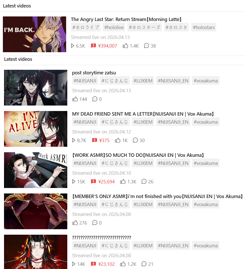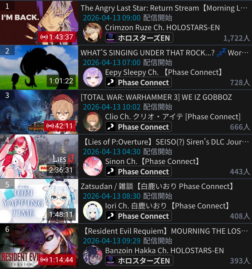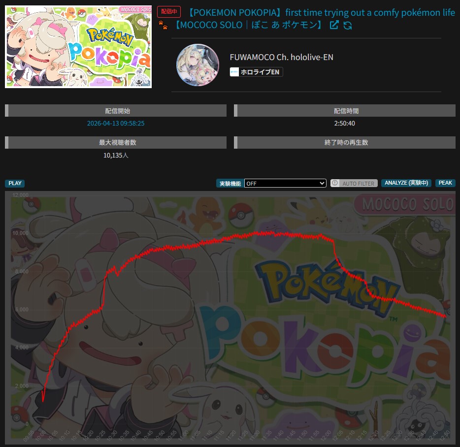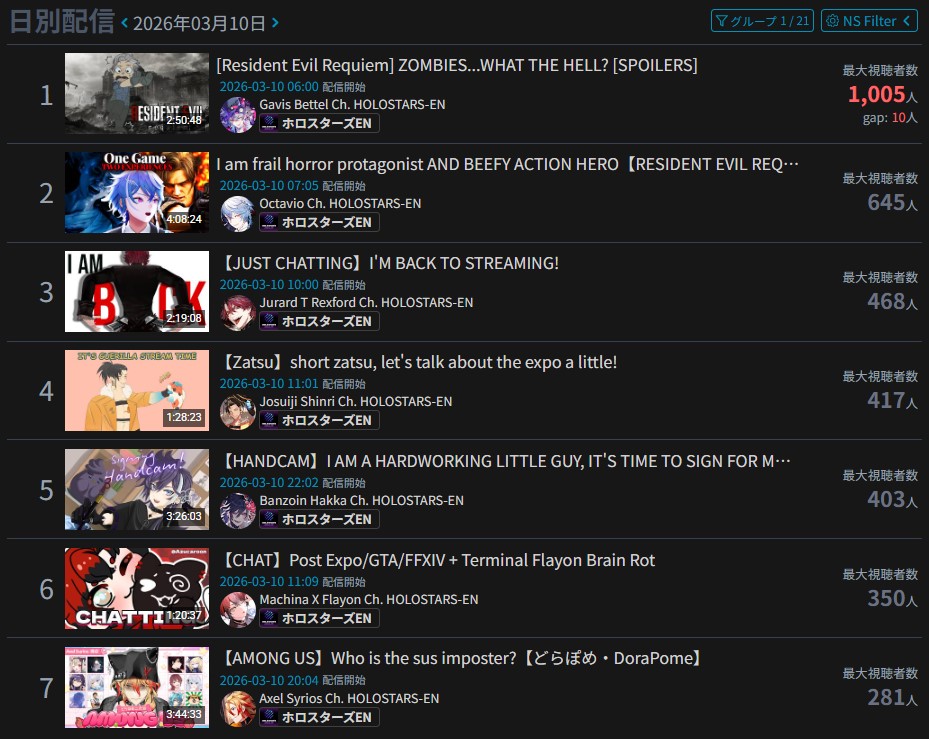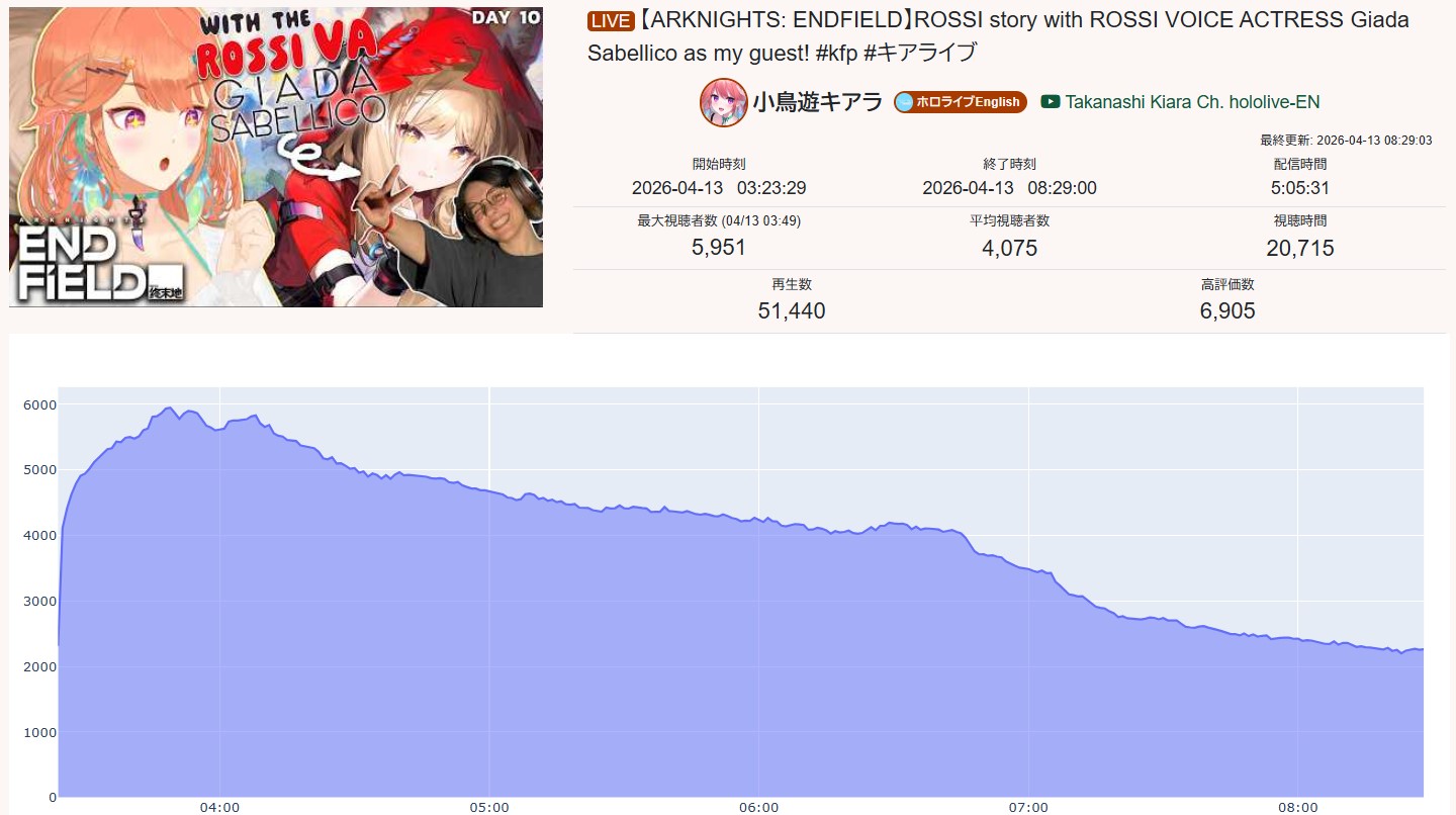 *APRIL 12TH 2026 FINAL EN TALLY*>12,683: FUWAMOCO (<3) (Hololive English)>10,018: Cecilia (Hololive English)>9,692: Cecilia (Hololive English)>7,400: Nerissa (Hololive English)>7,274: Bijou (Hololive English)>6,094: Calliope (Hololive English)HOLOEN-ONLY TALLY COUNTER: 6I was told someone was going to be in this tally, but I don't see him. Gold for Fuwawa and Mococo Abyssgard with their playthrough of the Mortuary Assistant alongside Gigi, Silver for Cecilia Immergreen's playthrough of Spider Man plus Drinking Game, Bronze for Cecilia Immergreen's playthrough of Resident Evil Requiem alongside Baelz.>RANKING PER POINTS (Gold = 3, Silver = 2, Bronze = 1)Gigi = 15pFUWAMOCO, Calliope = 13pBijou = 12pCecilia = 8pHololive English = 3pKiara, Kronii = 2p[IRyS, Baelz], Nimi = 1p