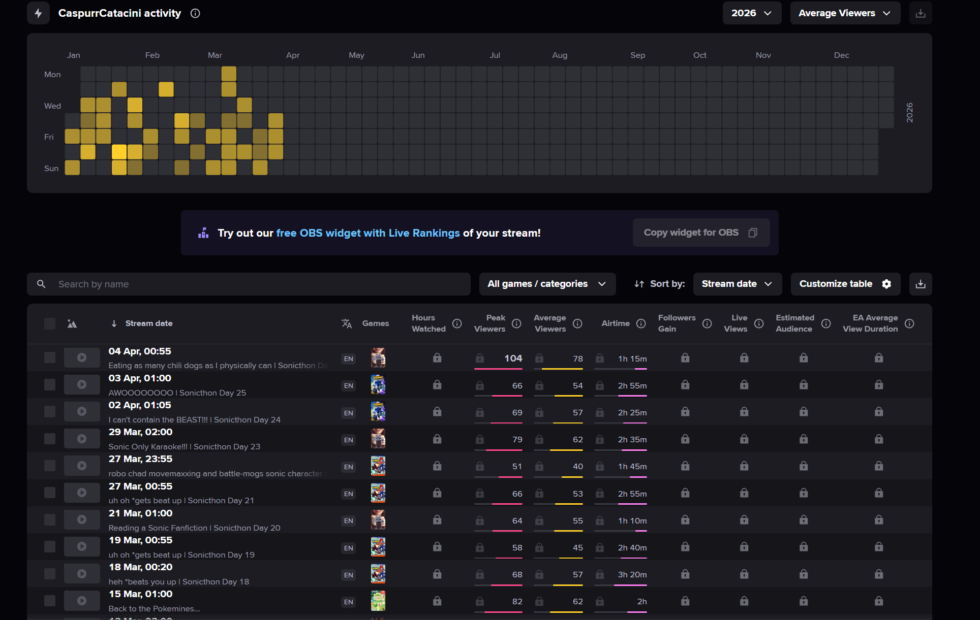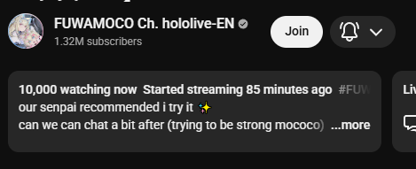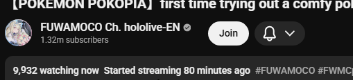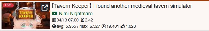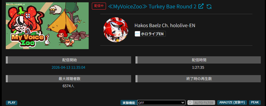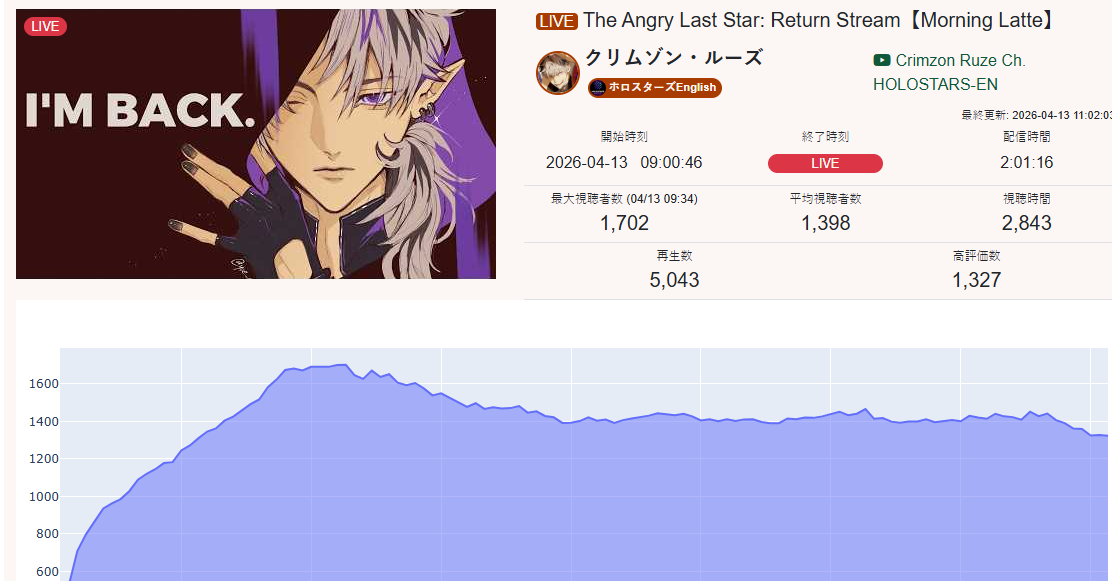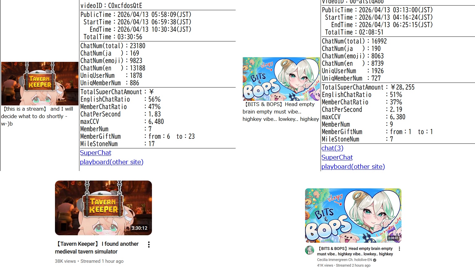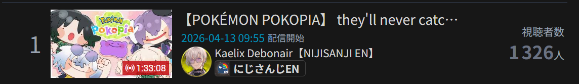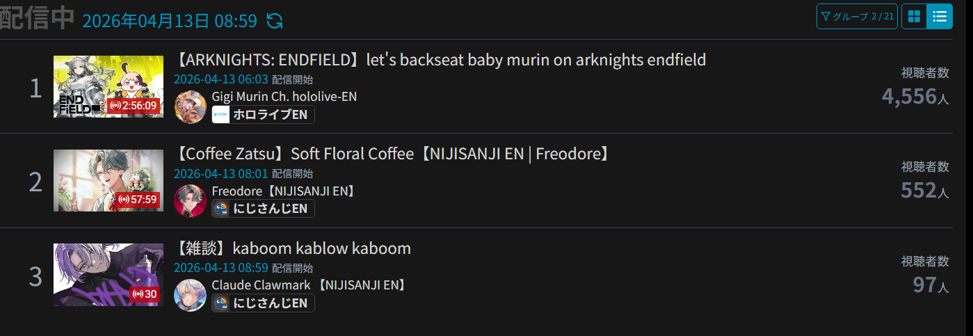 *APRIL 12TH 2026 FINAL EN TALLY*>12,683: FUWAMOCO (<3) (Hololive English)>10,018: Cecilia (Hololive English)>9,692: Cecilia (Hololive English)>7,400: Nerissa (Hololive English)>7,274: Bijou (Hololive English)>6,094: Calliope (Hololive English)HOLOEN-ONLY TALLY COUNTER: 6I was told someone was going to be in this tally, but I don't see him. Gold for Fuwawa and Mococo Abyssgard with their playthrough of the Mortuary Assistant alongside Gigi, Silver for Cecilia Immergreen's playthrough of Spider Man plus Drinking Game, Bronze for Cecilia Immergreen's playthrough of Resident Evil Requiem alongside Baelz.>RANKING PER POINTS (Gold = 3, Silver = 2, Bronze = 1)Gigi = 15pFUWAMOCO, Calliope = 13pBijou = 12pCecilia = 8pHololive English = 3pKiara, Kronii = 2p[IRyS, Baelz], Nimi = 1p