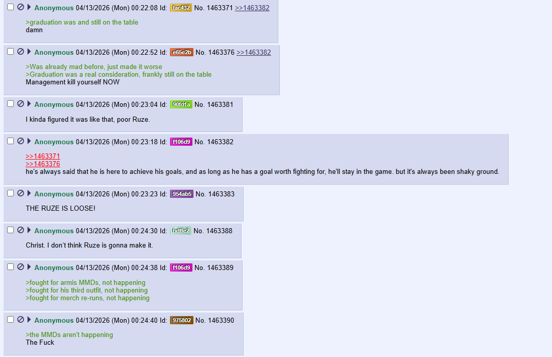 >>111056829>the bad but understandable thing about Cover is that they treat everyone the same wayThe alternative is Nijisanji where fucking cliques form and backstabbing happens.The vast majority of girls don't give a fuck than homos got canned though. But a lot of them would care if they did the same to ID.