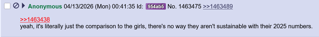 >>111056298Numbers are like half but not completely terrible, maybe that fag had a point, based Cover is pulling the plug anyways even if they make "some" money.They may have realized it hurts the girls marketing and profits more than what it could ever give back.