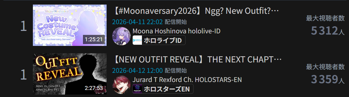 >>111051044APR 2026 EN GOLD4/1 - Calliope - Bonelliope Debut: 10,4254/2 - FUWAMOCO - Donkey Kong Country 2: 19,2894/3 - Calliope - Birthday Outfit Reveal: 12,5904/4 - Calliope - 3D Live: 45,3804/5 - Cecilia - Resident Evil Requiem: 13,1074/6 - Hololive English - Serendipity Announcements: 10,4154/7 - Gigi - HoloEN Parenting: 13,0734/8 - FUWAMOCO - Chrono Trigger: 9,8084/9 - Bijou - Slay the Spire 2: 8,6594/10 - Bijou - Hytale: 9,5734/11 - Bijou - Unarchived Karaoke: 8,9394/12 - FUWAMOCO - The Mortuary Assistant: 12,683PER COMPANY12x: Hololive EnglishHOLOLIVE ENGLISH HAS WON 35 GOLDS IN A ROW.PER STREAMER3x: [FUWAMOCO, Bijou], Calliope1x: [Gigi, Cecilia], Hololive English