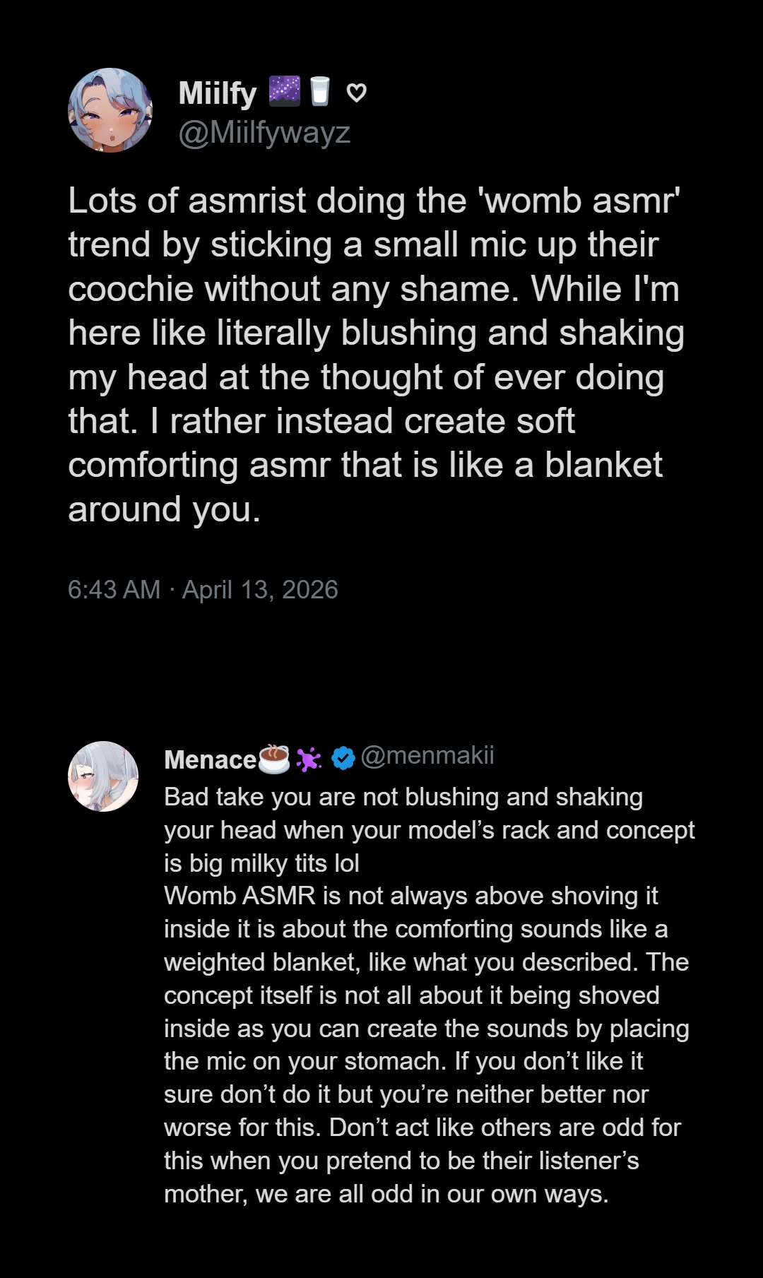 As a Human, I can live wite the fact that regular ASMR and ASMR porn can both exist. Just like you regular manga and pornographicmanga can coexist. Or how regular novels and smut can coexist.
