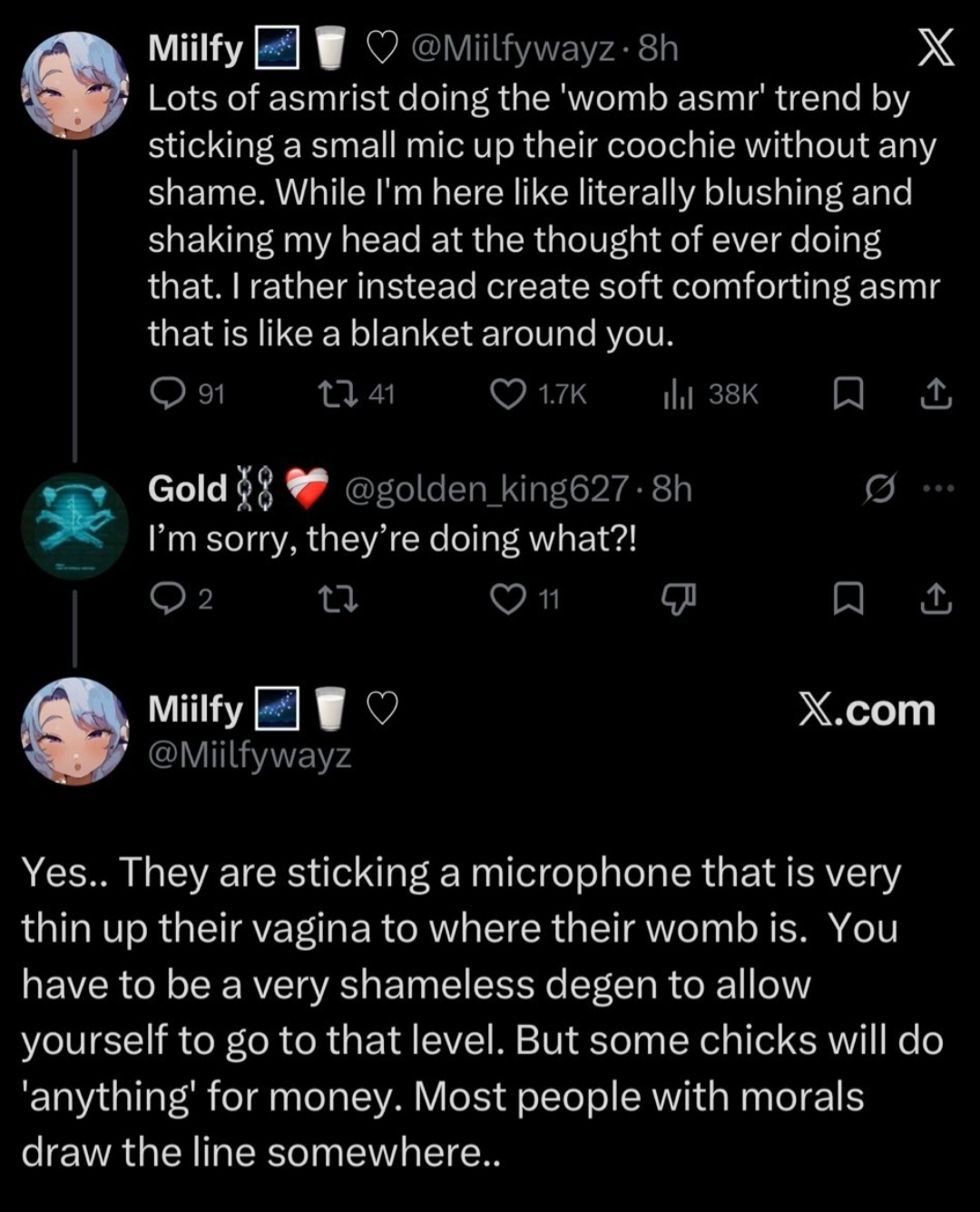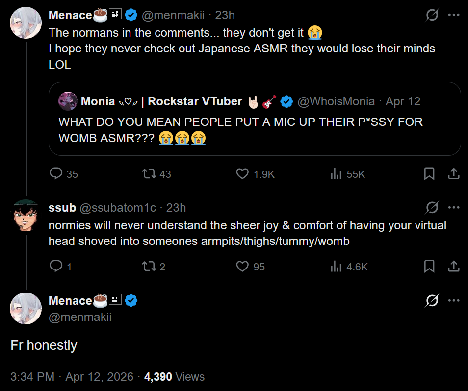 We (liggers who not sick in the head) don't support problematic ASMR in this thread. This includes Menace who has done pedophilic, rape, blackmail, and other disgusting scenarios.