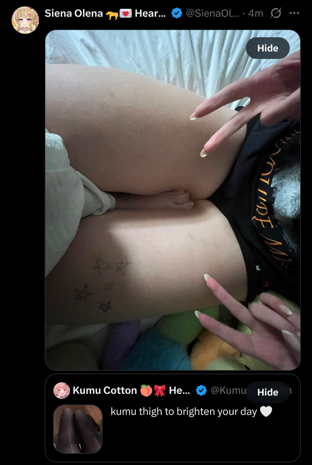 >>111081089>tattooI think kumu drew stars on her thigh with ballpoint pen