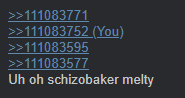 >>111083771>>111083752>>111083595>>111083577Uh oh schizobaker melty