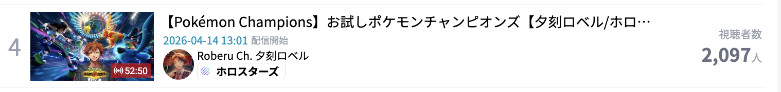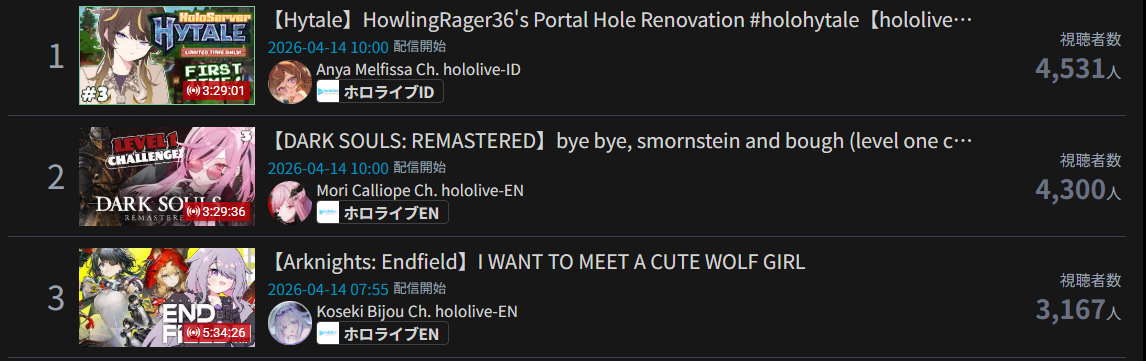 >>111088256MAR 2026 SILVER>1) 50,543: Nijisanji (nijisanji) Niji air riders fes>2) 39,195: Miko (hololive) BIOHAZARD requiem #3>3) 40,125: Miko (hololive) SoraMiko collab>4) 32,076: Subaru (hololive) Super Mario World #6>5) 30,989: Kuzuha (nijisanji) NijiZoff>6) 37,404: Hololive (hololive) holofes day1>7) 53,057: Hololive (hololive) holofes STAGE2 DAY2 free part>8) 59,748: Hololive (hololive) holofes STAGE4 DAY3 free part>9) 27,779: Miko (hololive) Pokemon FireRed>10) 35,457: Subaru (hololive) Mario Tennis Fever w/ Okayu>11) 29,892: Kuzuha (nijisanji) APEX>12) 32,136: Anya (hololive) 3D BIRTHDAY LIVE>13) 27,699: Kuzuha (nijisanji) APEX>14) 44,158: Nijisanji (nijisanji) Niji Apex 2026>15) 47,528: Koyori (hololive) Birthday Totsumachi>16) 36,233: Kou (nijisanji) niji pokemon 1on1 battle>17) 36,165: Subaru (hololive) Pokemon Pokopia>18) 33,052: Subaru (hololive) Super Mario World #7>19) 26,525: Ayame (hololive) 誰かの心霊写真 w/ Fubuki>20) 33,496: Koyori (hololive) 3D momotetsu w/ Chihaya, Korone, Polka>21) 35,772: IRyS (hololive) 3D LIVE Birthday>22) 115,649: VSPO (VSPO) VSPO! SHOWDOWN 2026 DAY2>23) 31,599: Miko (hololive) Pokemon FireRed #9>24) 56,411: Miko (hololive) miComet advice corner>25) 44,042: Pekora (hololive) slots>26) 32,489: Subaru (hololive) Pokemon Pokopia>27) 34,486: Vivi (hololive) gyakutotsu + announcement>28) 37,713: Miko (hololive) 1on1 collab w/ Akami Karubi>29) 54,635: Chaika (nijisanji) new 3D reveal>30) 16,567: Mio (hololive) AsaMio>31) 39,917: Miko (hololive) break announcement> PER COMPANY7x: nijisanji23x: hololive1x: VSPO> PER STREAMER7x: Miko5x: Subaru3x: Hololive, Kuzuha2x: Nijisanji, Koyori1x: Anya, Kou, Ayame, IRyS, VSPO, Pekora, Vivi, Chaika, Mio