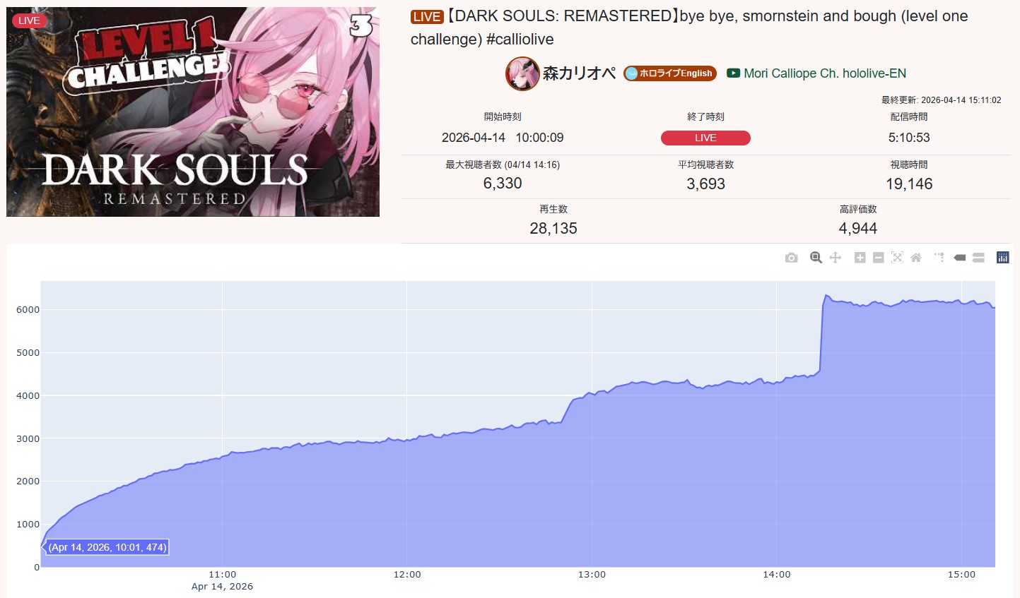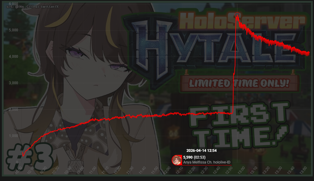 >>111088305MAR 2026 HIGHLANDER>1) 52,306: Akairo Mia (Brave Group) NEWTOWN clipshow>2) 81,490: Nene (hololive) 3D Live Birthday>3) 40,481: Miko (hololive) Biohazard requiem FINALE>4) 32,076: Subaru (hololive) Super Mario World #6 [S]>5) 30,989: Kuzuha (nijisanji) NijiZoff [S]>6) 64,838: Hololive (hololive) holofes STAGE free part>7) 39,839: Toya (nijisanji) 8th anniversary totsumachi [B]>8) 52,187: Pekora (hololive) Important Announcement [B]>9) 46,398: Elu (nijisanji) Niji Apex fes 2026 team & rules announcement>10) 45,512: Marine (hololive) Mario Tennis Cup>11) 20,944: Noel (hololive) Mario Tennis Fever [5th]>12) 45,192: Okayu (hololive) Mario Tennis totsumachi>13) 18,362: Ibrahim (nijisanji) Tales of the Abyss #4 [6th]>14) 46,807: Kronii (hololive) 3D Birthday Live + New Outfit>15) 47,528: Koyori (hololive) Birthday Totsumachi [S]>16) 36,233: Kou (nijisanji) niji pokemon 1on1 battle [S]>17) 72,610: Shellin Burgundy (nijisanji) 8th niji mario kart tournament>18) 38,736: Popo (774 inc) NEWTOWN lookback>19) 26,525: Ayame (hololive) 誰かの心霊写真 w/ Fubuki [S]>20) 158,104: Lunlun (nijisanji) 3D reveal>21) 109,611: VSPO (VSPO) VSPO! SHOWDOWN 2026 DAY1>22) 155,694: Suisei (hololive) 8th anniversary LIVE>23) 49,321: Lize (nijisanji) NijiPoke1on1>24) 32,917: Lui (hololive) Minecraft hololive land [4th]>25) 18,881: Fura Kanato (nijisanji) birthday totsumachi [5th]>26) 37,002: Shigure Ui (indie) stream ends when Watame tweets>27) 34,486: Vivi (hololive) gyakutotsu + announcement [S]>28) 26,487: Ryushen (nijisanji) niji mahjong tournament [6th]>29) 54,635: Chaika (nijisanji) New 3D reveal [S]>30) 20,454: Fuwamoco (hololive) LEAGUE OF LEGENDS>31) 18,750: Patra (indie) ASMR [6th]> PER COMPANY1x: Brave Group15x: hololive11x: nijisanji1x: 774 inc1x: VSPO2x: indie