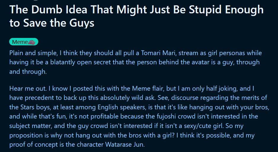 >>111087844Another "real male vtubers have never been tried" suggestion, considering the examples given are all homo-tier or lower