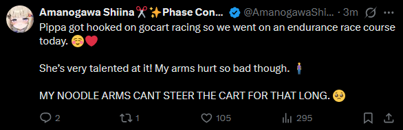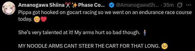 >>111092353Pippa does seem the type to enjoy gocarts. I have a harder time imagining shiina though, It feels like she would be thrown off at the first corner pass.