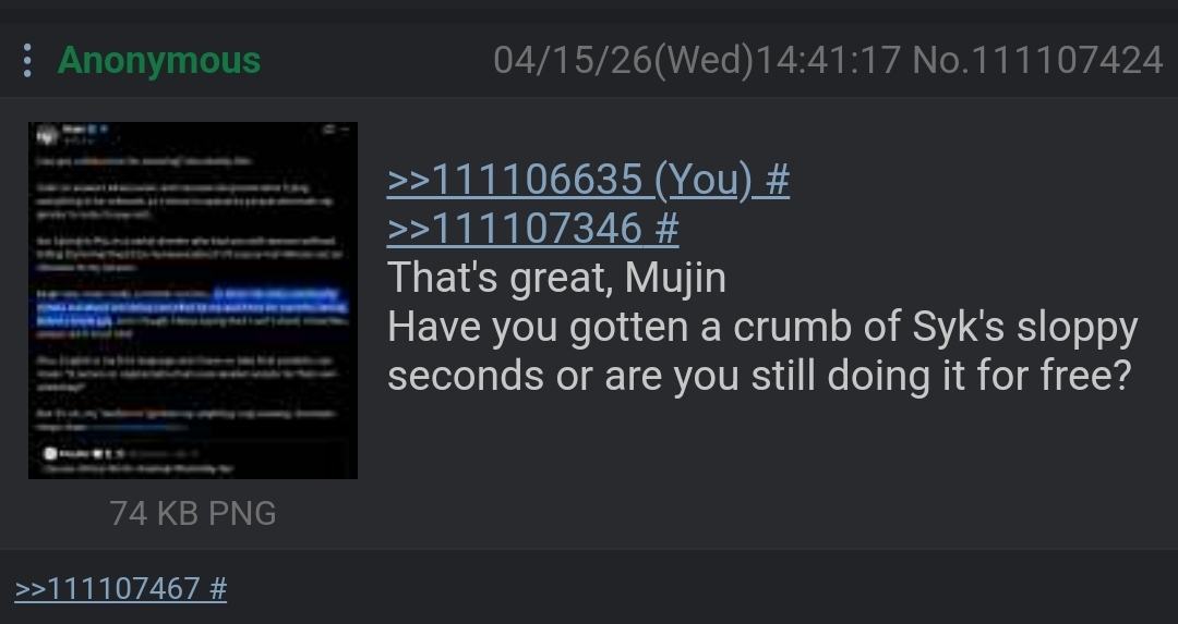 >>111106635>>111107346That's great, MujinHave you gotten a crumb of Syk's sloppy seconds or are you still doing it for free?