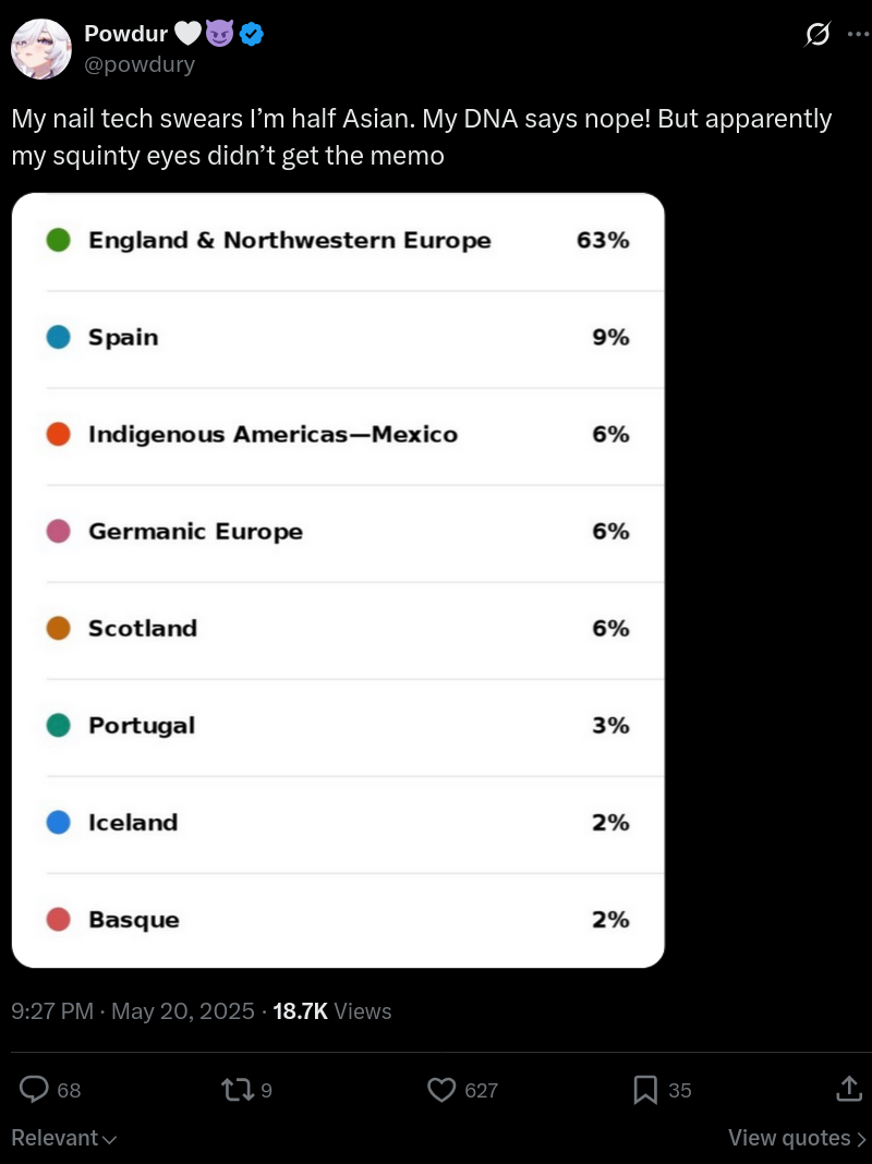>>111129618>>111129923She sold her DNA to one of those private genome testing websites and posted the results on her twitter.