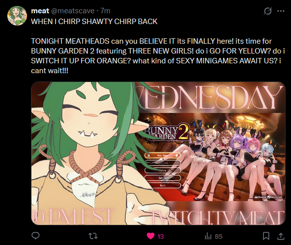 Retard Bat Edition>What is /lig/?/lig/ is a thread for viewers to find, share, and discuss indie vtubers who have on average 500 viewers or more.>Why /lig/?Large indie vtubers have more net fans, but they are outnumbered by 2views by the thousands. This is a thread for the VIP, regardless of what language they stream on.>Can I shill my 499view oshi here?Considering averages fluctuate widely, all the way down to 100 is reasonable. The minimal requirement however is being Twitch partner or the YouTube equivalent in numbers.>Wait isn't that one a corpo?/lig/ is a thread for chuubas of a decent size who aren't defined by their corporate branding, either due to the small size of the corporation or the independence and lack of oversight granted to the talents>/lig/ Numbershttps://lignumbers.neocities.org/>Twitch Clips Guidehttps://pastelink.net/34vd5>VOD Archival Guidehttps://rentry.org/Vod_Archival_Guide>/lig/ VOD Archivehttps://rentry.org/Indie_Vod_Archives_lig_>Koikatsu cardshttps://mega.nz/folder/JYtkXJwL#07gAQCQqI_9FsmX9oQJKSA>/lig/ Wheel of Nameshttps://wheelofnames.com/5jh-93j>Tiermakerhttps://tiermaker.com/create/-lig--16586688-3>/lig/ Chuuba Birthday Calendar (WIP)https://www.canva.com/design/DAE-XgWodVg/ofLz4QC1yPPQ4T6TTAE0fw/edit?utm_content=DAE-XgWodVg>Upcoming BirthdaysApril 18th - SarueiApril 19th - Yoclesh & ZumaApril 23rd - Coqui & Limealicious & MomotexxApril 24th - Sugi AokiApril 27th - Peach MilkyMay 3rd - CharlottexBearMay 4th - Dya Rikku & ImakuniMay 6th - Nino EgynMay 14th - Peo YukinoshitaMay 17th - GrimmiMay 20th - Zentreya>OC material for the OPhttps://mega.nz/folder/IIVD1IaJ#cfsRhWdJvzneIoG8HZUPuw>/lig/booruhttps://ligbooru.moe/>Duckshttps://www.twitch.tv/dashducks (embed) (embed) (embed) (embed) (embed) (embed)Other useful threads:>>>/vt//big/>>>/vt//corpo/>>>/vt//choc/>>>/vt//flip/>>>/vt//haha/>>>/vt//indie/>>>/vt//mint/>>>/vt//swarm/>>>/vt//vrt/>>>/vt//xvsj+/Previous Thread: >>111105251