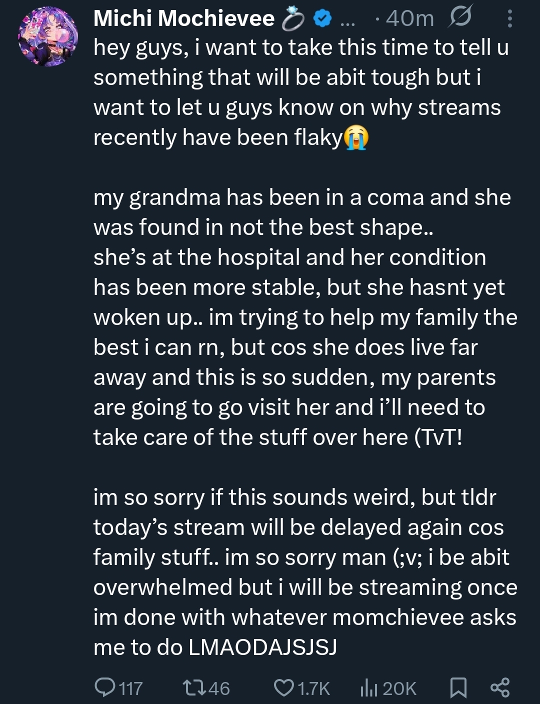 >>111116786Poor Michi...She deserves to take some time to handle her family stuff, most streams go on for half a day