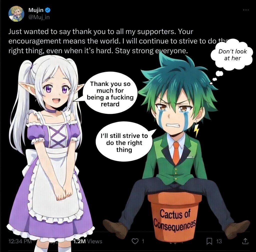 >>111136295Stop posting on here, Mujin. Crash out on Twitter. It's funnier.