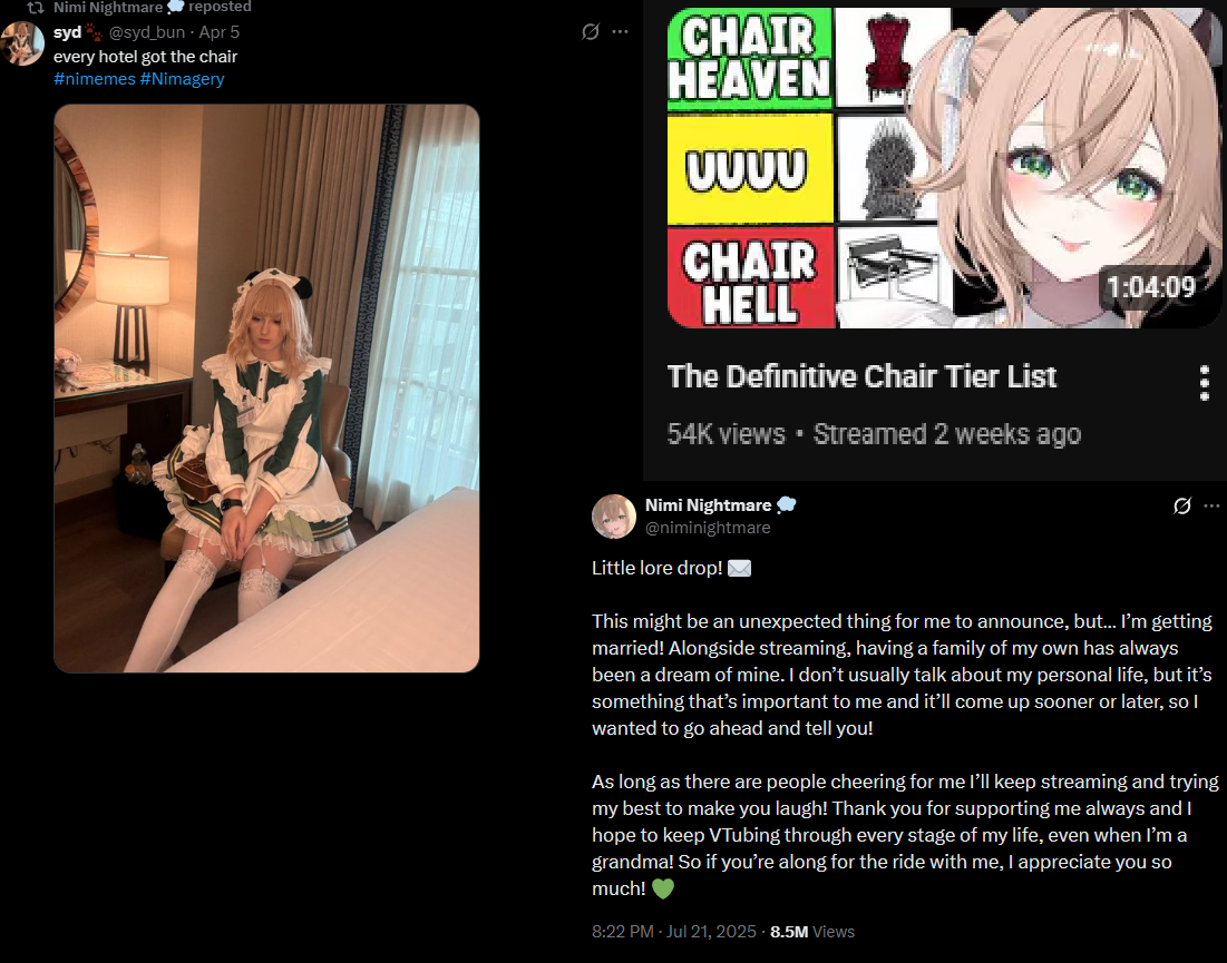 >>111121607i genuinely don't know which fanbase is the bigger cuck: the girl who openly announced her marriage, or the girl who made NTR fetish her entire persona before getting hired by hololive and still cucks her fans