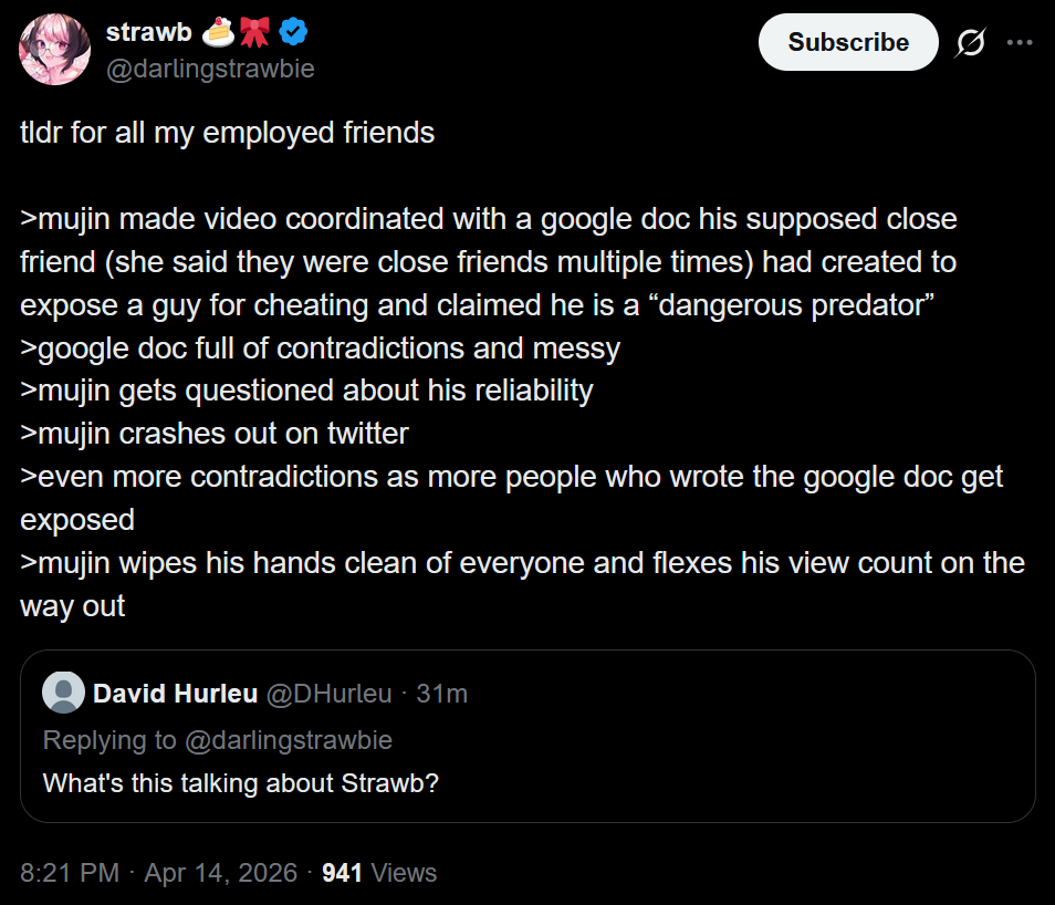 while we're all talking about this again i'm surprised how nobody has brought up the audio recording that one chick did of sykkuno is likely illegal because several states have one way consent recordings banned now, so if sykkuno is in lets day california, florida, or about 10 other states he could sue this chick and mujin for damages.cheers.