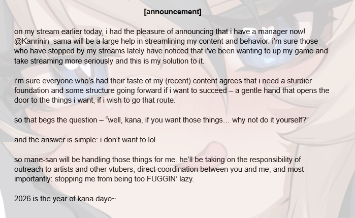>>111141110Her announcement was pretty funny. All her fans have to go through him to interact with her.