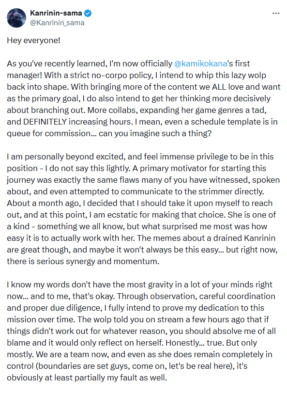 they will watch if the content is good, and wont if it isnt. i just wanna actually try and make kana stream more, do more stuff. so i reached out and attempted to tame the brat. it was successful, and i convinced her to at least try. and yes, we knew there would be backlash like this. its alright. she just refused to do all this kind of work, and we figured being honest up front instead of people eventually figuring out there was a shadow manager would be better in the long term