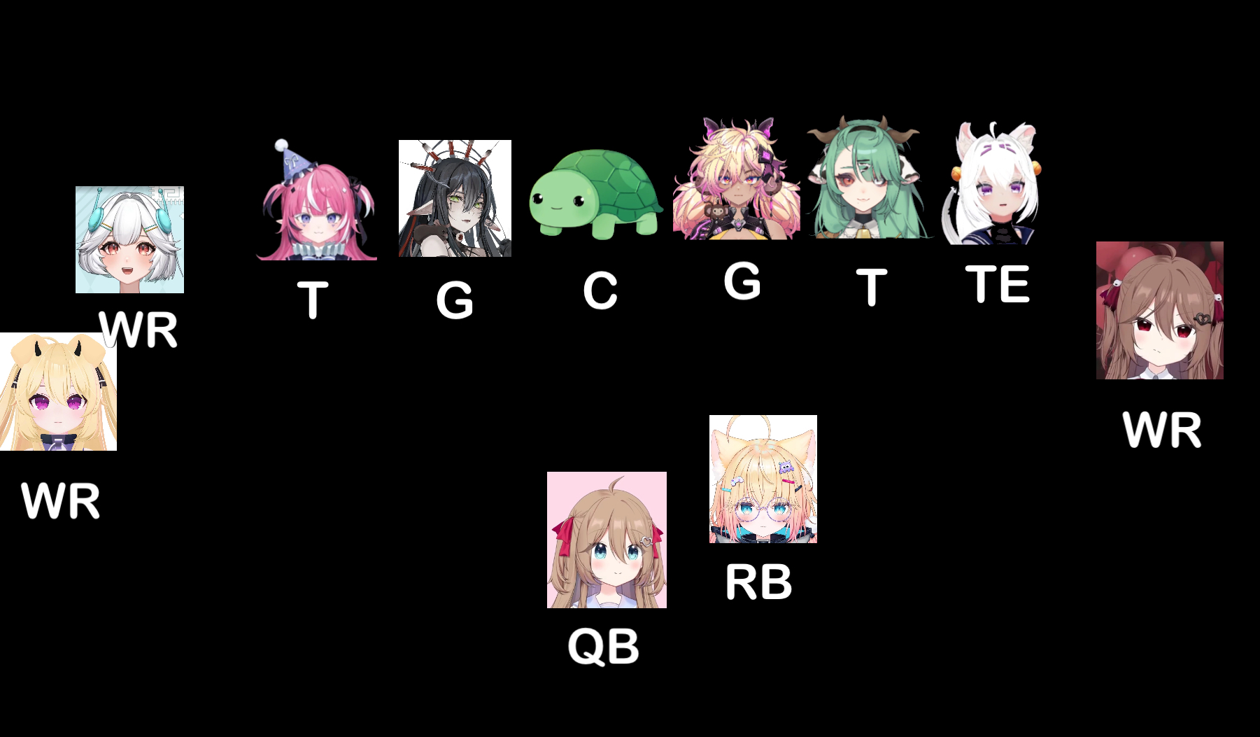 >>111145760Sure. You asked for it. >Neuro is the qb because she is Neurosama. >Filian is clearly the best player. Could fill any spot. TE blocks and catches passes. Hopefully she can patch some of the many deficiencies. >Evil has diva number one WR vibes. >Mini dances and has a little wiggle. Hopefully that’ll be enough to slip by the line at RB. >Camila adds some very needed beef to Neuro’s blindside at LT. Shame Anny got cut. >The center is the leader of the line. And I thought Vedal would appreciate the occasional ball fondling. >Having chemistry on the line is important. The Koko/Crelly duo at RG and RT sounds nice on paper. I think Koko would be better at pulling so she got the guard spot. Hopefully they’ll enjoy hitting people. >That left Layna, Cerber, and Ellie. Ellie would die at the line, so that likes her up outside at WR. Hopefully her lanky frame might have a ball fall into her hands. >I think Layna is “meaner” than Cerber, so she goes on the line. Could only work with what I was given.