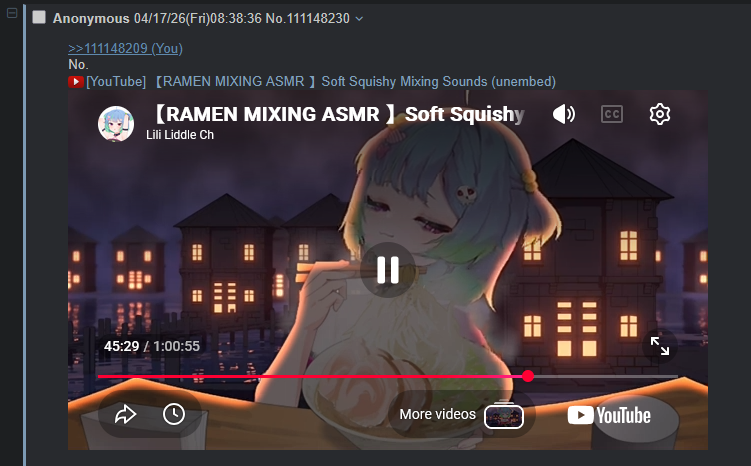 >>111146152Ramen mixing ASMRhttps://www.youtube.com/watch?v=J8k7dY2fcrk