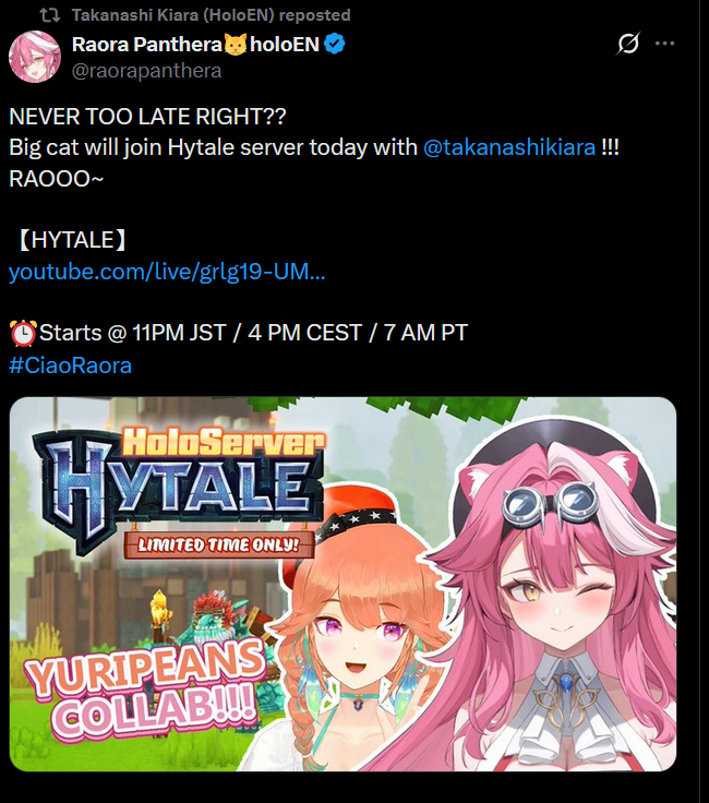 Ohh nice Raora's joining the Hytale server. Now we just need Cecilia to join as well