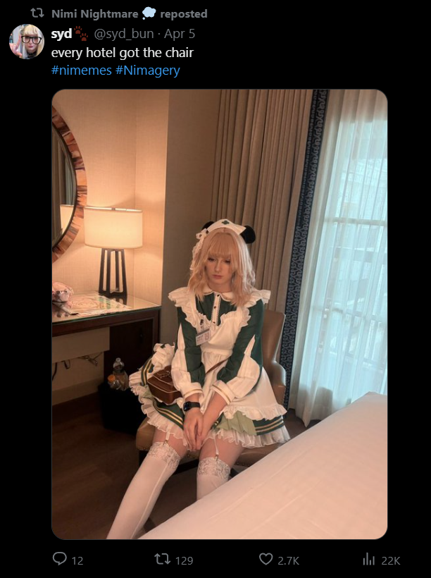 >>111156620I can't be angry because it's not only something she's getting invited and paid for but it's not some random retard 3view streamer who but someone with a portfolio