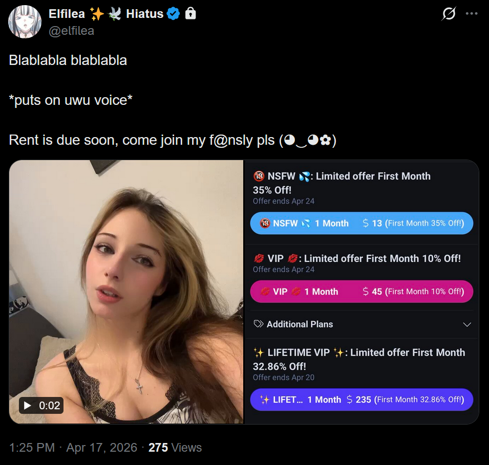 >Plapcow cutting down on fansly