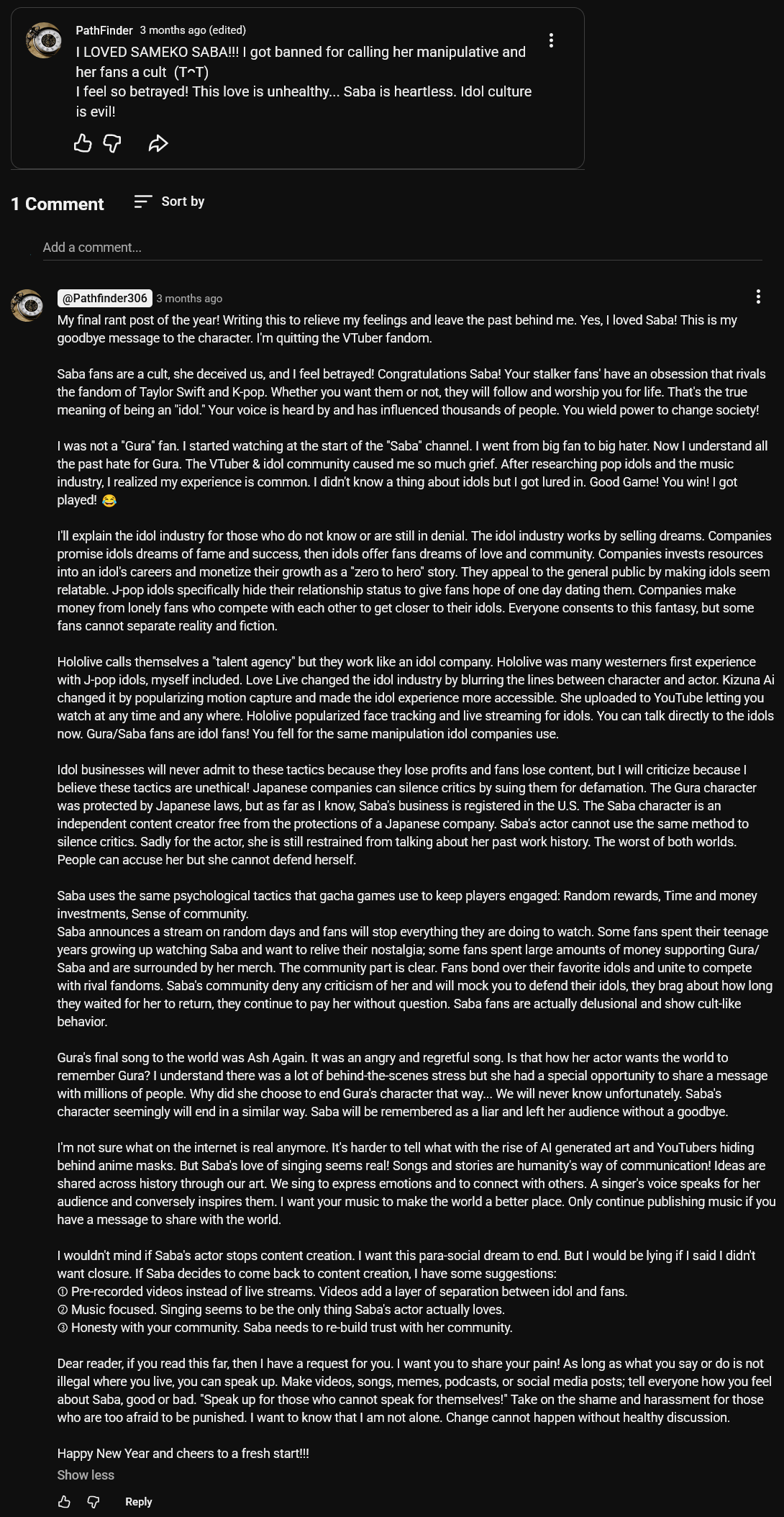 >>111174063To be honest, I never really watched them, but I'm glad kawaii died. Their fans are very arrogant. They deserve this schizo as well to remind them of their place.