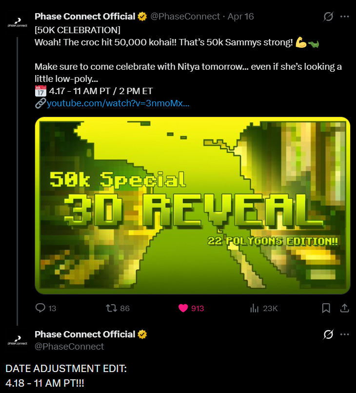 3D Model Reveal waiting room:https://www.youtube.com/watch?v=3nmoMxGzWZw>>111165813Yeah, It will be great!Phase Connect official account announced it on twitter, it was retweeted by many phase girls as per usual.https://x.com/PhaseConnect/status/2045177889558053039