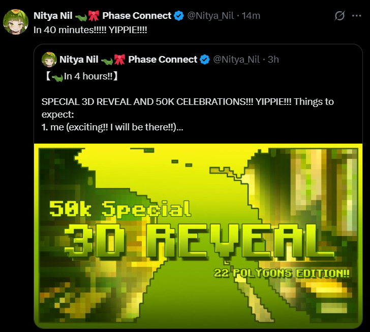 In ~20 minutes!>SPECIAL 3D REVEAL AND 50K CELEBRATIONS!!! YIPPIE!!! Things to expect: >1. me (exciting!! I will be there!!)>2. tail (not as cool but its okay!!)https://x.com/Nitya_Nil/status/2045553427065745840