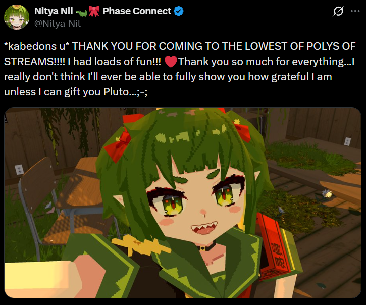 >*kabedons u* THANK YOU FOR COMING TO THE LOWEST OF POLYS OF STREAMS!!!! I had loads of fun!!! <3 Thank you so much for everything...I really don't think I'll ever be able to fully show you how grateful I am unless I can gift you Pluto...;-;https://x.com/Nitya_Nil/status/2045627112514535626I forgot to post it yesterday
