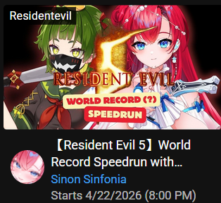 Nitya and Sinon collab on Wednesday.They will play Resident Evil 5.Waiting room:https://www.youtube.com/live/d9rl_I9U8y4