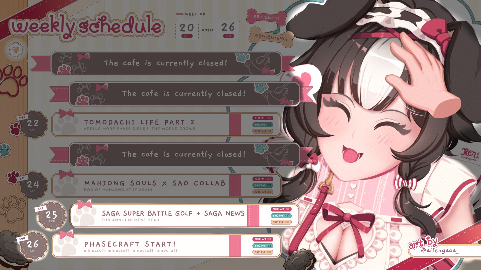 Info from Bibi's scheduleSaturdaySaga Collab - Super Battle Golf + Saga News6pm PDT, 3am CETSundayPhasecraft start! (maybe Nitya will join her)6pm PDT, 3am CETBibi schedule:https://x.com/BibiBiscuitCh/status/2046476278925263359