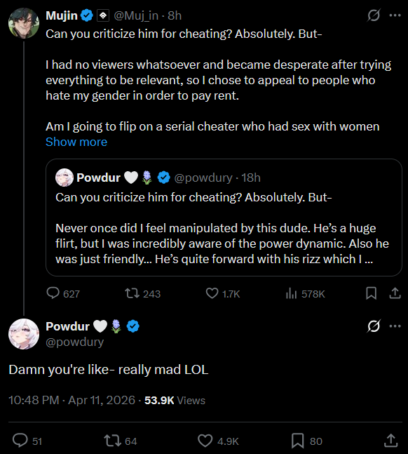 >>111206815>>111206976The real reason Mujin fumbled this whole bullshit wasn't the misuse of the word "predator" as everyone pretends, it's actually because he sperged out about bbc like a typical SEAAfter that nobody wanted to be on side and everyone silently agreed to shit on his instead, plus he was trying to get in bed with one of "the victims"