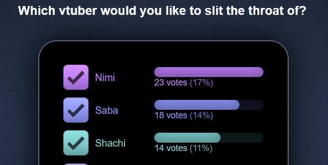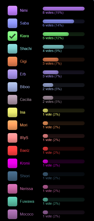 >>111184096Motherfuckers really want me to believe there are 30+ people looking at /#/ right now? We have like 9 posters total. Pathetic bot wars.Anyways, I only voted Kiara to counter-act what I assumed would be a Nimi Sweep. Please don't kill me, non-existent KFPs of which there are none here.