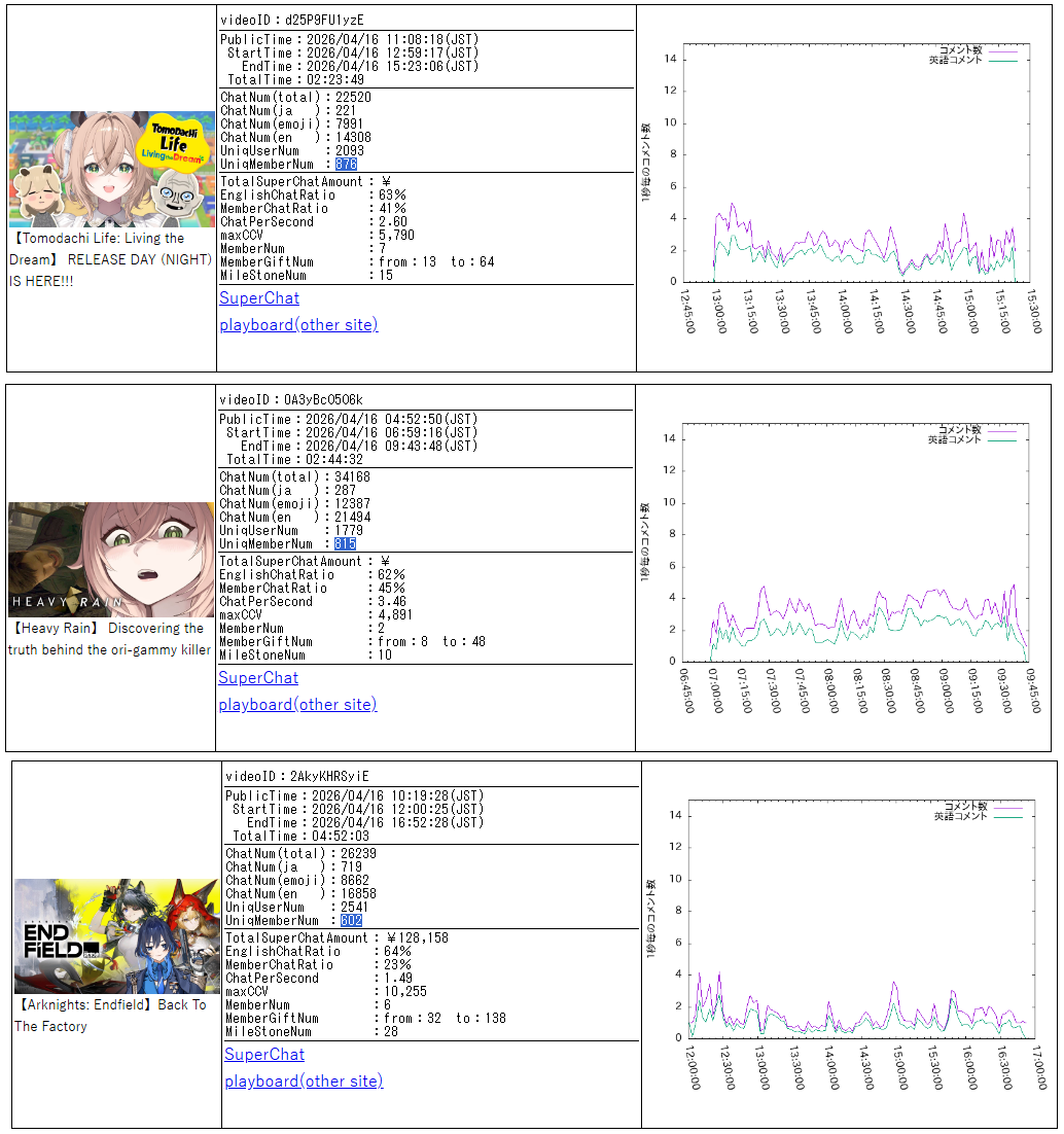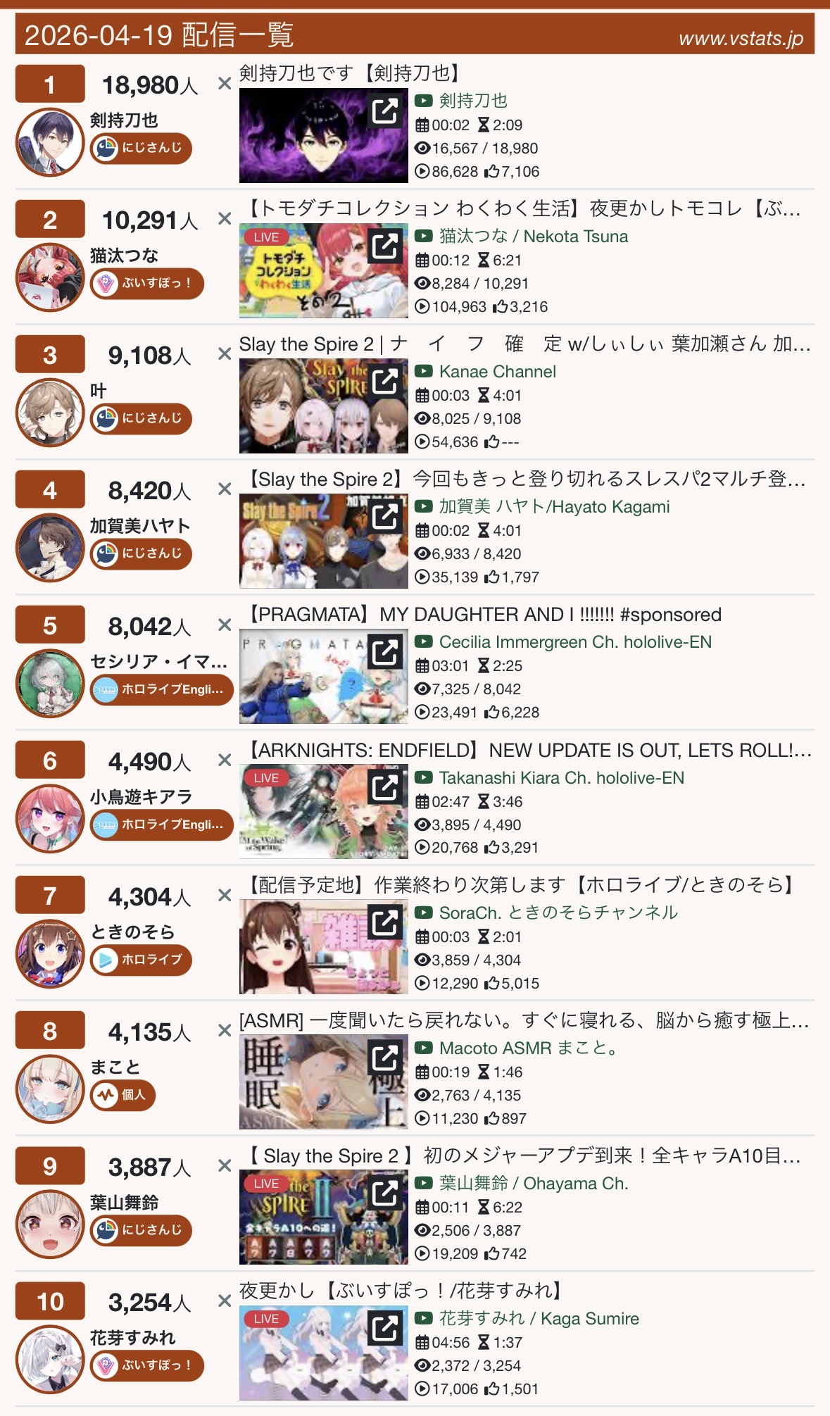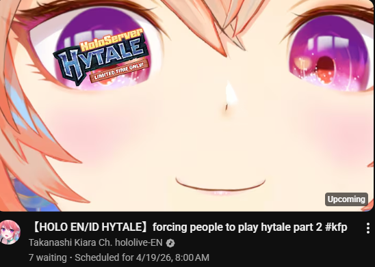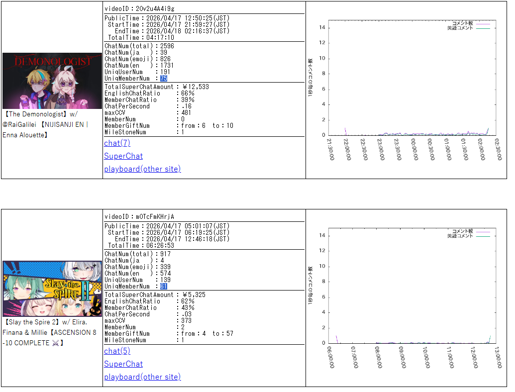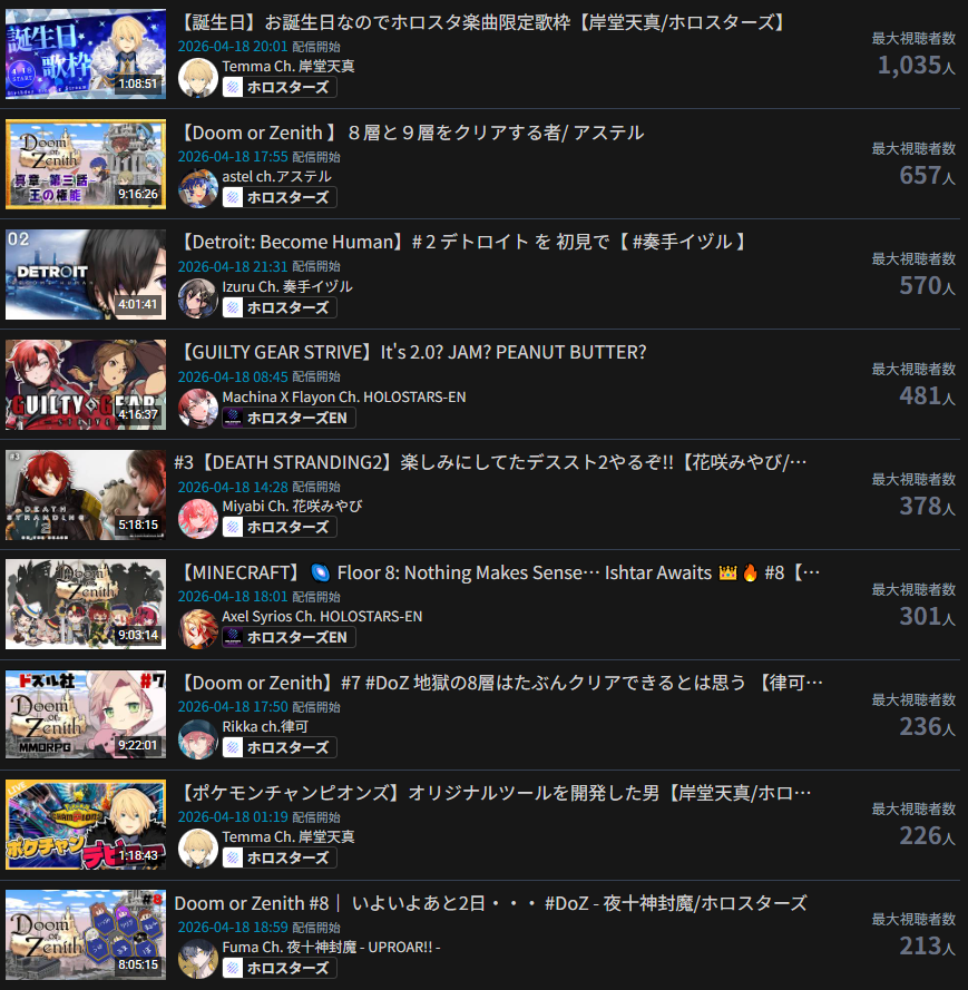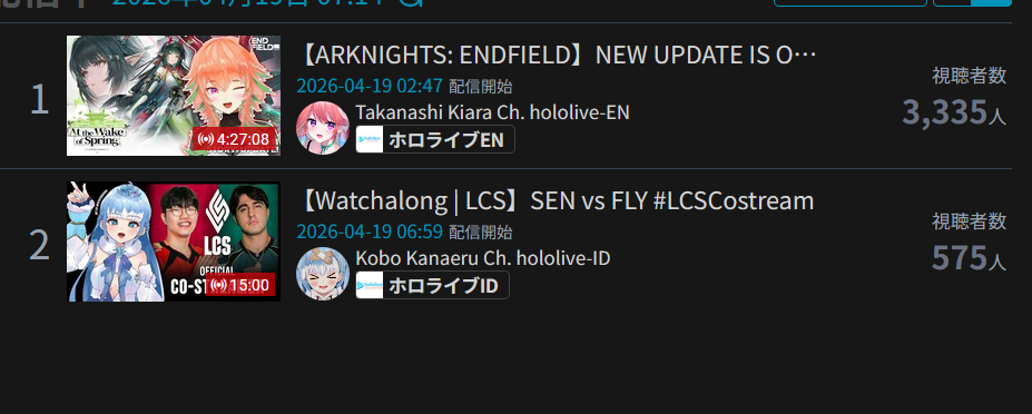 *APRIL 18TH 2026 FINAL EN TALLY*>7,791: IRyS (Hololive English)>6,761: Nimi (Indie)After the emotional tally from yesterday, something more mild today. Gold for Hoozuki IRyS' playthrough of Pragmata, Silver for Nimi Nightmare's playthrough of Tomodachi Life, Bronze for no one.>RANKING PER POINTS (Gold = 3, Silver = 2, Bronze = 1)Bijou = 19pCalliope = 17pFUWAMOCO, Gigi = 16pCecilia = 8pKronii = 7pIRyS = 4pKiara, Elizabeth, Baelz, Hololive English, Nimi = 3p