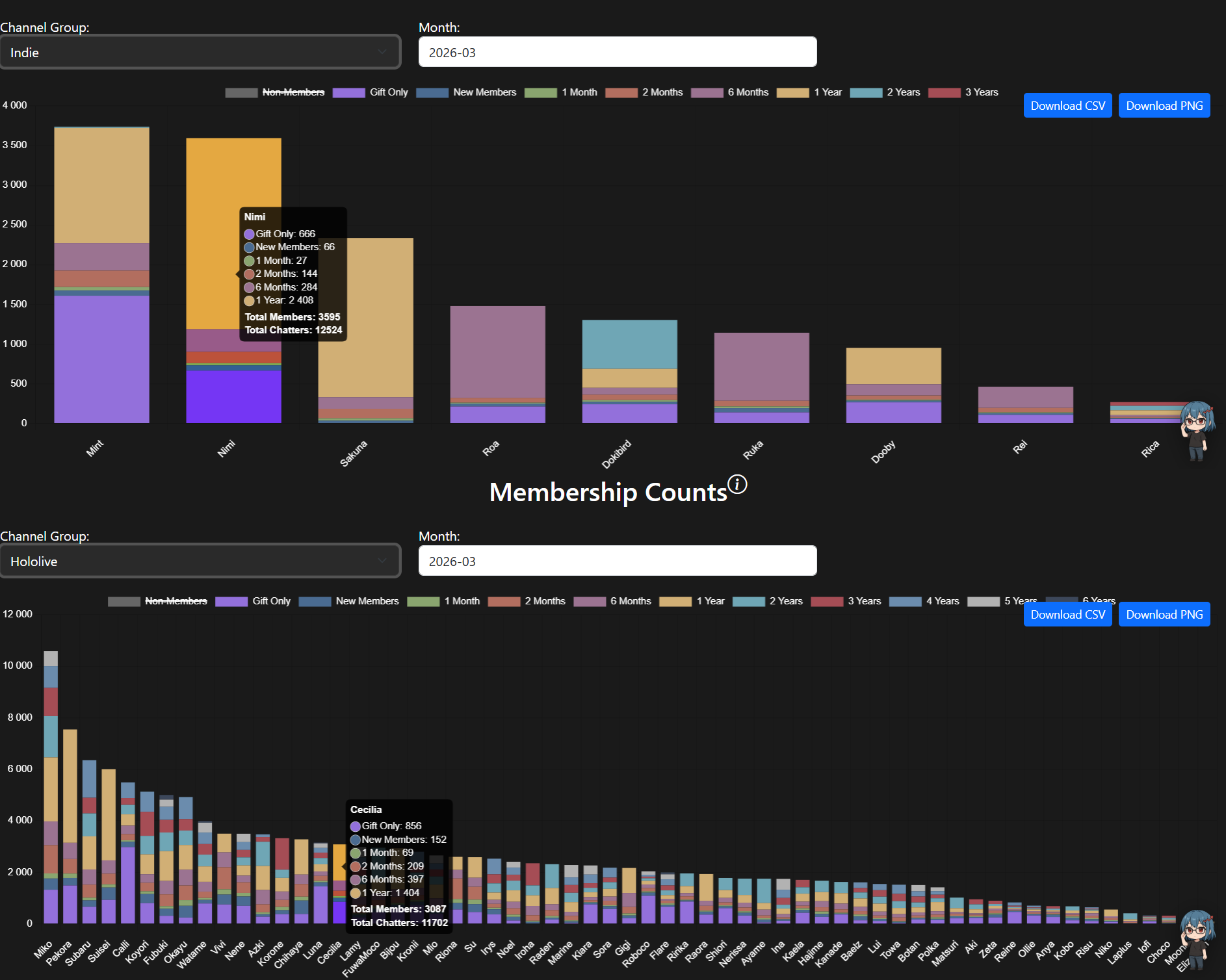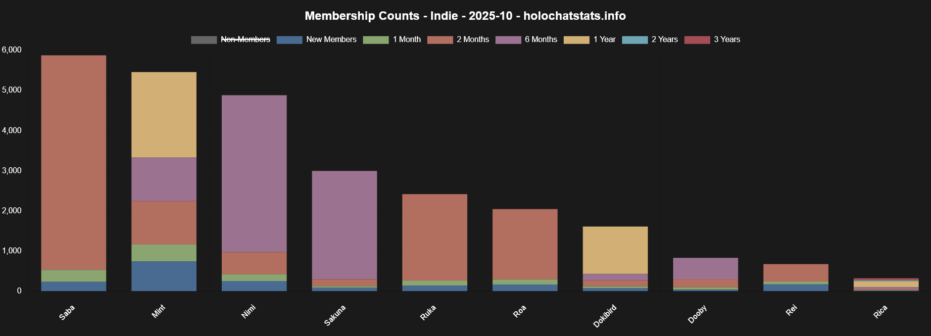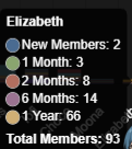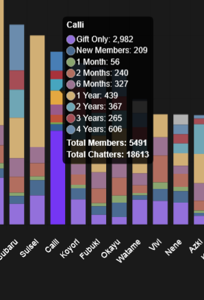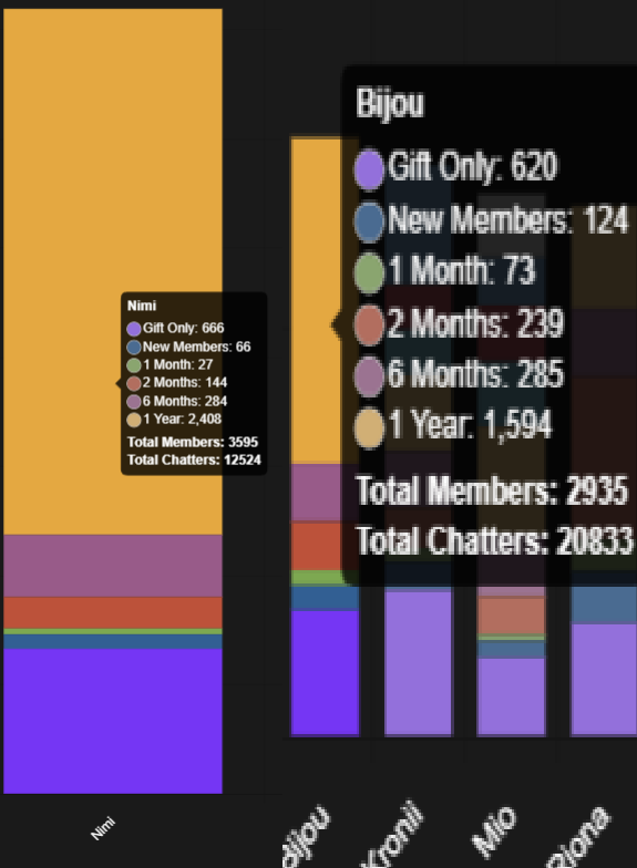 >>111188376The chart shows Bijou with 285 members with a "6-month" badgeNimi had 284 members with a "6-month" badgeThese are, by definition, new members acquired within the past six months.But compare that to members with the "1-month" and "2-month" badges.Nimi is doing a lot worse in the past two months, then she was in the four months prior.