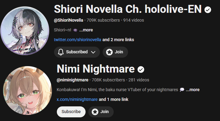 >>111184349There is not really a way to count Shachimu, she is not on VStats nor Vrabi and you would have to be an absolute retard to try and use Playboard.It's also why, if Namie ever got to 5k or more, she wouldn't count. It's not only because they're not VTubers (Global counts PLAVE per example), but because they're not registered.