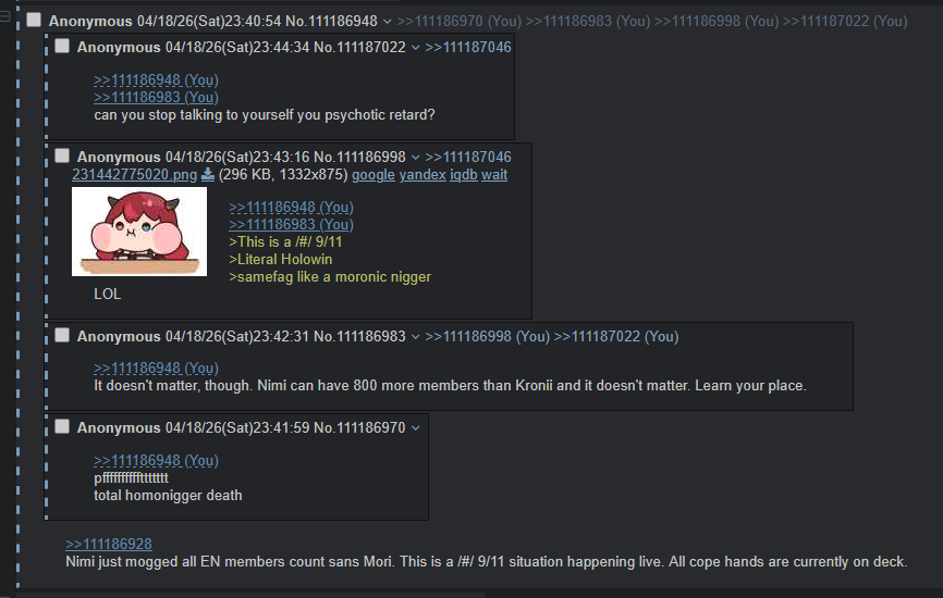 >>111188652But i'm right here calling you a cucknigger lolMaybe you're mad because "yourself" is just being a pathetic seething faggot who hates hololive like a cuck