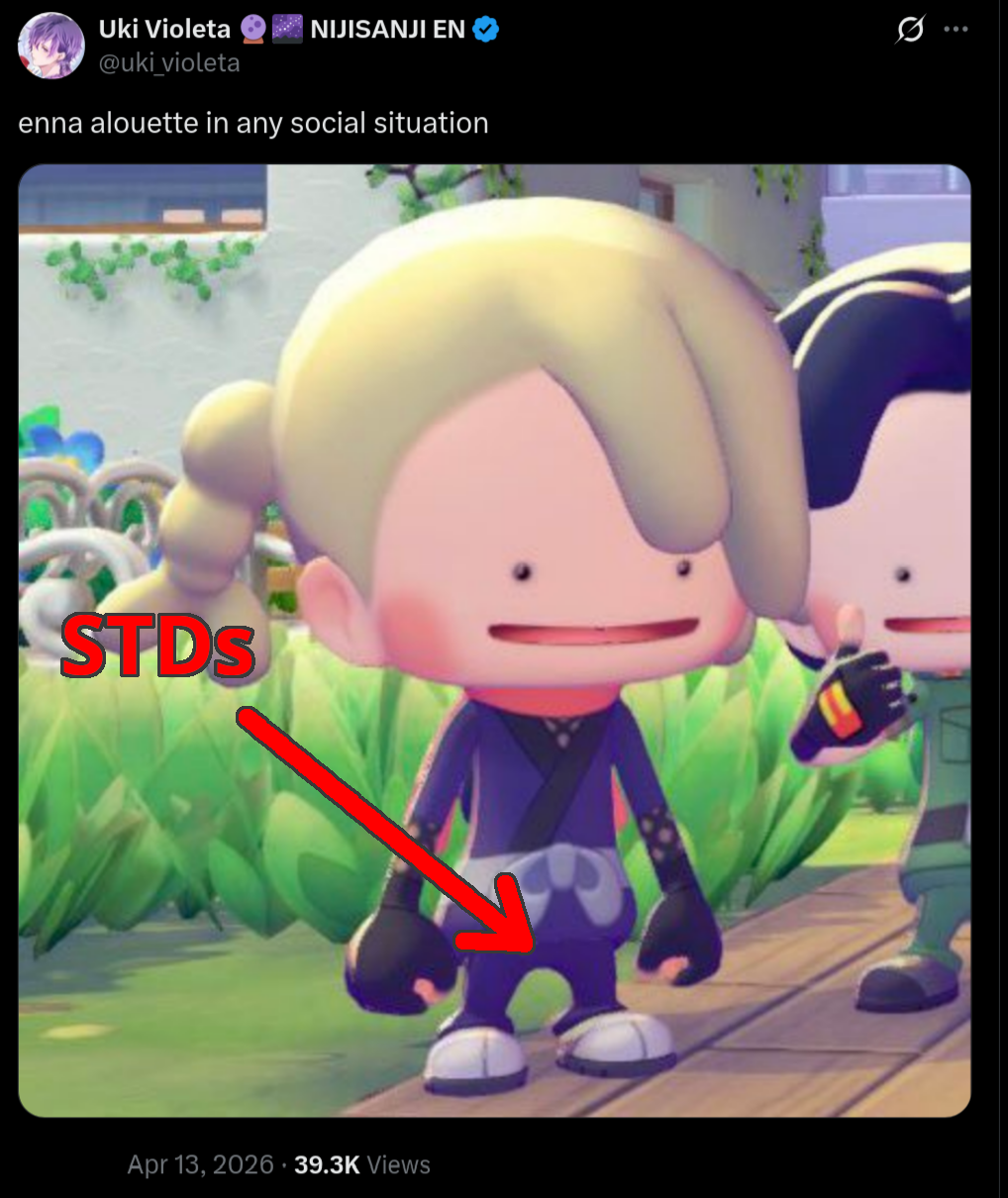 Enna whined about not being popular anymore and said she didn't want to be popular anyway (blatant lie). She used to go on long tangents bragging about how 'famous' she supposedly was and how nobody around her could match her income level.As per usual for her, she's hiding all sorts of secrets from chat which she lets slip here and there. In this case she is buying a house and moved most of her stuff to her aunt's place in preparation. She also keeps referencing "health issues" without being forthcoming about what exactly she's talking about, since that would expose some uncomfortable truths.She repeatedly lies about not graduating likely due to a management mandate, even though her collab spam makes her graduation far too obvious. This emboldens theories that she will pull an Ike and vanish one day while deleting everything.As usual Enna often refers to the character in the third person in the context of lying to her chat. To Enna "playing a character" doesn't mean actually taking a new personality or backstory, it just means "lying to fans".