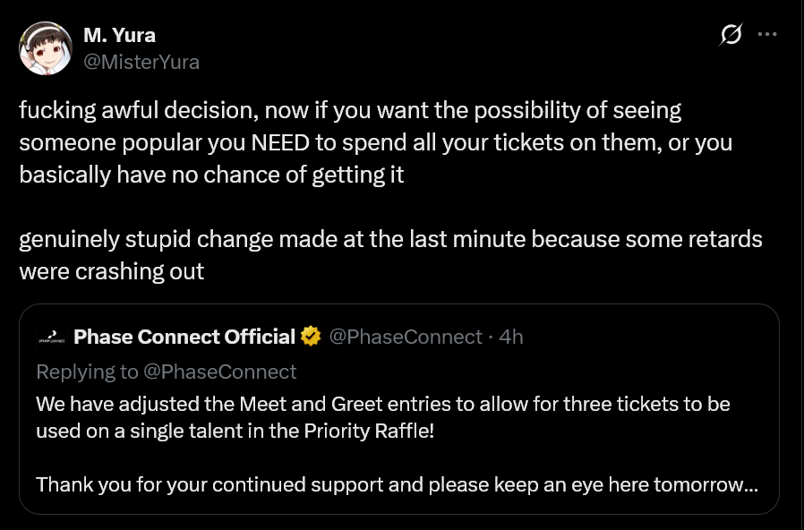 >>111195575imagine the fags that are going specifically for the m&g and losing the gacha. Can you still ticket trade/buy to get the meet and greet?