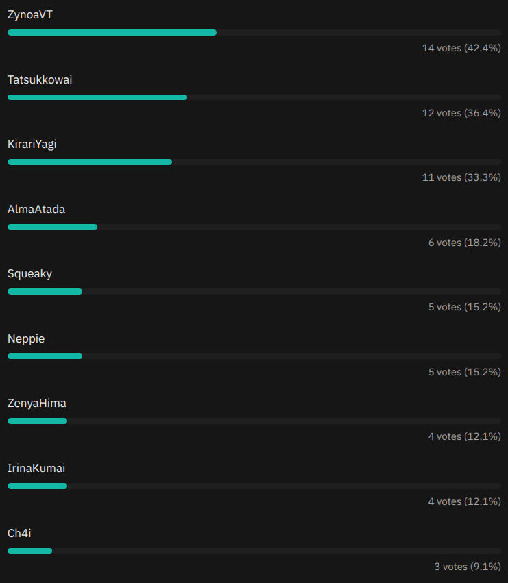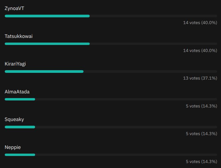 NTA, but Noa was obviously leading with a lot of support in the thread. No one was really talking about Tatsu except herself, she was even behind Yagi, and then out of nowhere she gets a spike in votes and catches up to Noa after pollfag tried to rig it? 4 to 14?There are way too many people here who got kicked out of Noa community and now carry a grudge. What’s even the goal of this thread? I agree that any PNG vtuber should move elsewhere.