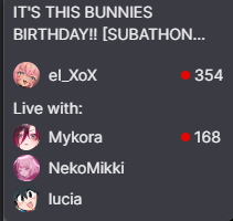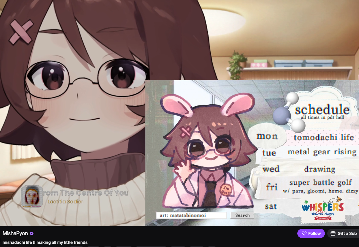 Literally Mii Edition>What is /lig/?/lig/ is a thread for viewers to find, share, and discuss indie vtubers who have on average 500 viewers or more.>Why /lig/?Large indie vtubers have more net fans, but they are outnumbered by 2views by the thousands. This is a thread for the VIP, regardless of what language they stream on.>Can I shill my 499view oshi here?Considering averages fluctuate widely, all the way down to 100 is reasonable. The minimal requirement however is being Twitch partner or the YouTube equivalent in numbers.>Wait isn't that one a corpo?/lig/ is a thread for chuubas of a decent size who aren't defined by their corporate branding, either due to the small size of the corporation or the independence and lack of oversight granted to the talents>/lig/ Numbershttps://lignumbers.neocities.org/>Twitch Clips Guidehttps://pastelink.net/34vd5>VOD Archival Guidehttps://rentry.org/Vod_Archival_Guide>/lig/ VOD Archivehttps://rentry.org/Indie_Vod_Archives_lig_>Koikatsu cardshttps://mega.nz/folder/JYtkXJwL#07gAQCQqI_9FsmX9oQJKSA>/lig/ Wheel of Nameshttps://wheelofnames.com/5jh-93j>Tiermakerhttps://tiermaker.com/create/-lig--16586688-3>/lig/ Chuuba Birthday Calendar (WIP)https://www.canva.com/design/DAE-XgWodVg/ofLz4QC1yPPQ4T6TTAE0fw/edit?utm_content=DAE-XgWodVg>Upcoming BirthdaysApril 23rd - Coqui & Limealicious & MomotexxApril 24th - Sugi AokiApril 27th - Peach MilkyMay 3rd - CharlottexBearMay 4th - Dya Rikku & ImakuniMay 6th - Nino EgynMay 14th - Peo YukinoshitaMay 17th - GrimmiMay 20th - ZentreyaMay 24th - FilianMay 29th - CottontailVA>OC material for the OPhttps://mega.nz/folder/IIVD1IaJ#cfsRhWdJvzneIoG8HZUPuw>/lig/booruhttps://ligbooru.moe/>Duckshttps://www.twitch.tv/dashducks (embed) (embed) (embed) (embed) (embed) (embed)Other useful threads:>>>/vt//big/>>>/vt//corpo/>>>/vt//choc/>>>/vt//flip/>>>/vt//haha/>>>/vt//indie/>>>/vt//mint/>>>/vt//swarm/>>>/vt//vrt/>>>/vt//xvsj+/Previous Thread: >>111241501