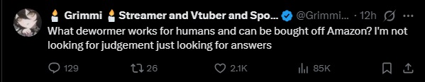 >>111249735the doctor vtuber said its ok to take pamoate for worms which you can buy over the counter so hopefully she buys that