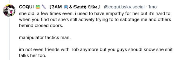 >>111249949When Coqui was fighting Grimmi on Bluesky she flat out said Tob is not her friend.