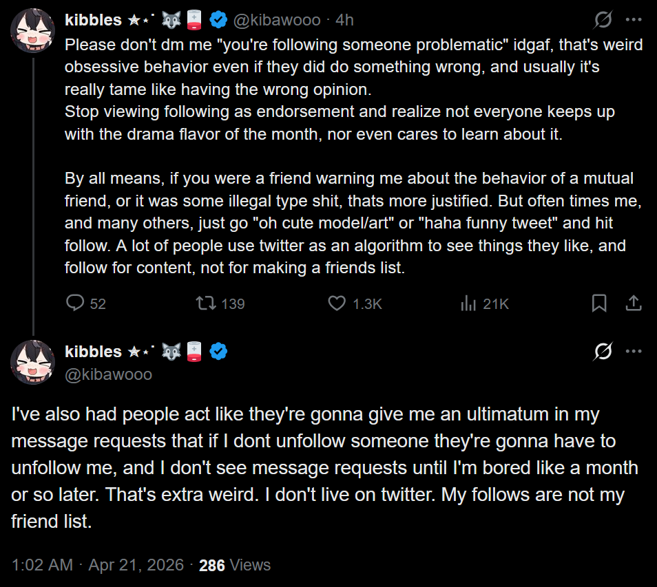 >>111250473The whole "follow =/= endorsement" disclaimer is cringe, cringe that the modern internet even needs to be reminded of such a simple fact. Shame that only normies seem to understand that you can disagree with people and still like them for something else but the terminally online view everything like tribal warfare.