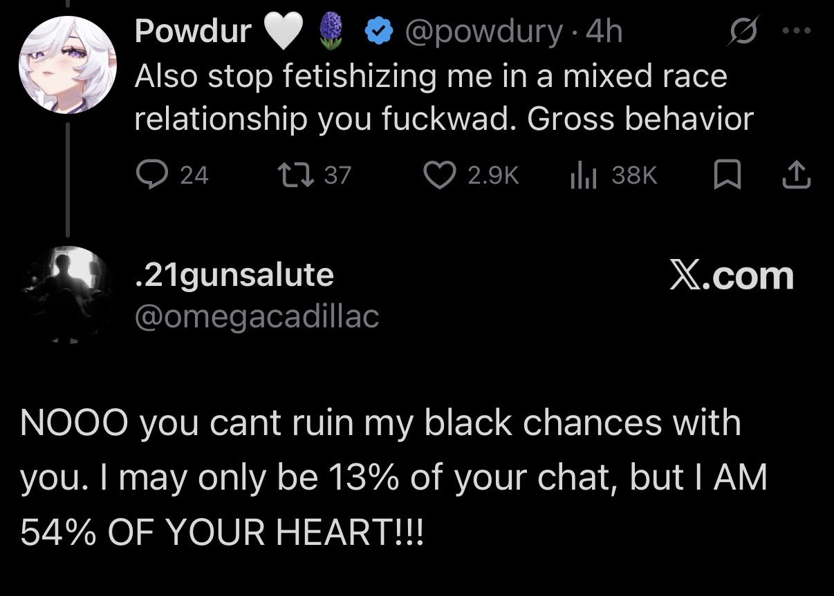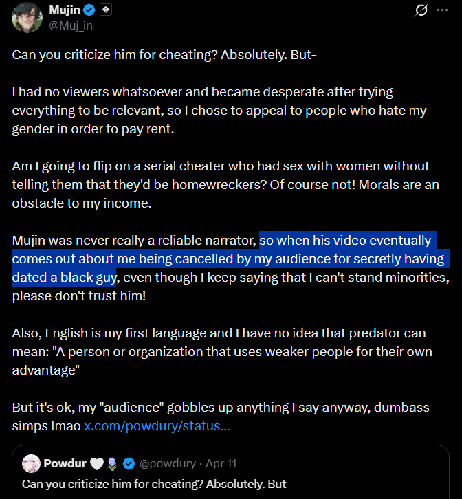 >>111258895>rightoid racist grifter>flirts with a chink streamerfoids will be foids no matter what. their values go outside the window the moment nobody's looking